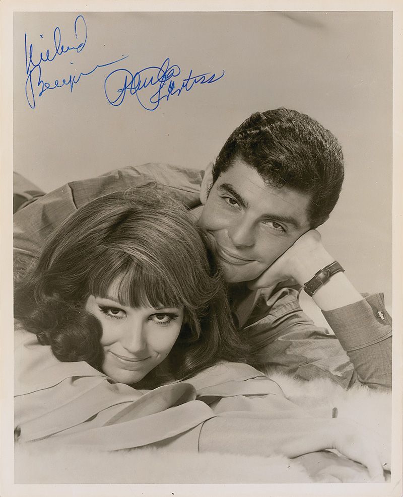 Glossy 8 x 10 photo of the couple lounging on a fur rug, signed in blue ink by both. A couple light brushes to signatures, as well as a bit of trivial irregular ink adhesion, and some light crazing to finish, otherwise fine condition.