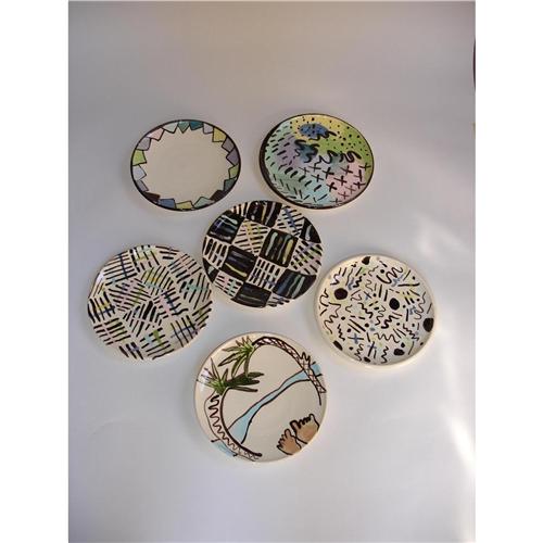 6 Colorful chargers. Back signed "Paula Sweet 1986"