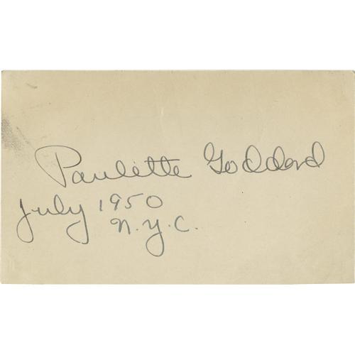 <B>Paulette Goddard Autograph.</B></I> A 3" x 5" notecard signed by the actress and former spouse of Charlie Chaplin in black ink, in Very Fine condition with mild tanning and some soiling along the left edge.<BR><BR><b>Shipping:</b> Flat Material, Small (<a target="_blank" href="http://www.heritageauctions.com/common/shipping.php">view shipping information</a>) <BR><BR><B>Important notic