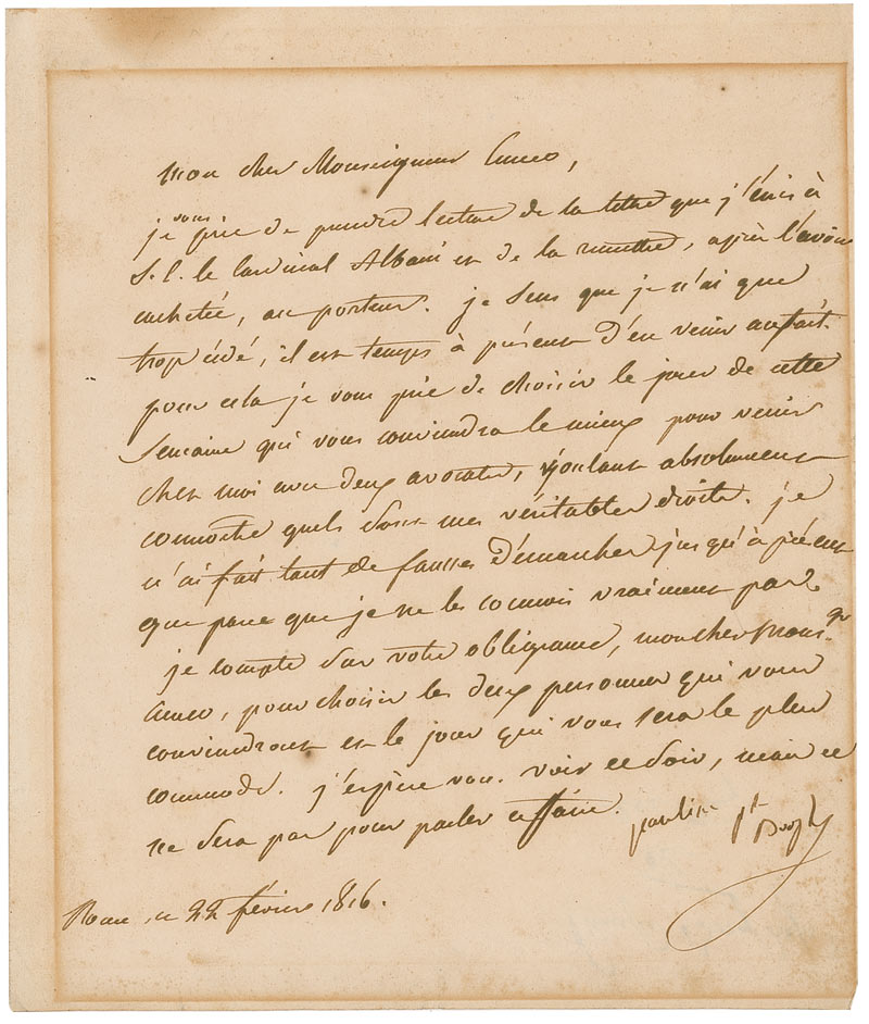 Napoleon’s sister (1780–1825), who served as a model for Antonio Canova’s ‘Victorious Venus.’ She was also Napoleon’s most loyal sibling, visiting him in exile and liquidating her assets to assist him. LS in French, signed “Pauline pr. Borghese,” one page, 8.25 x 9.75, February 22, 1816. Letter to Monsignor Cuneo concerning a letter to Cardinal Albane with whom she is losing patience over the matter of settling what are her true rights. She asks the Cardinal to come to her with two lawyers by that evening. In very good condition, with block of toning from previous display and scattered toning and foxing.