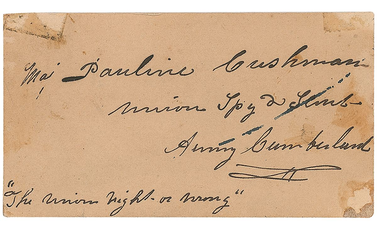 Very rare ink signature, “Maj. Pauline Cushman, Union Spy & Scout, Army Cumberland, ‘The Union Right of Wrong,’” on an off-white 3.25 x 1.75 card. In very good condition, with uniform toning, a bit of scattered light spotting affecting a few letters of signature, and old tape remnants to three corners.
