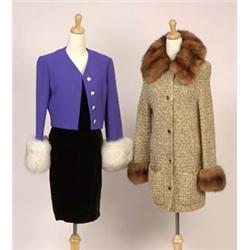 Pauline trigere fox trimmed evening jacket Waist length fitted royal purple evening jacket with V-neckline, hidden rhinestone center front buttons, long sleeves trimmed in white fox . Labelled Pauline Trigere. Size small. 150 / 175 Illustrated