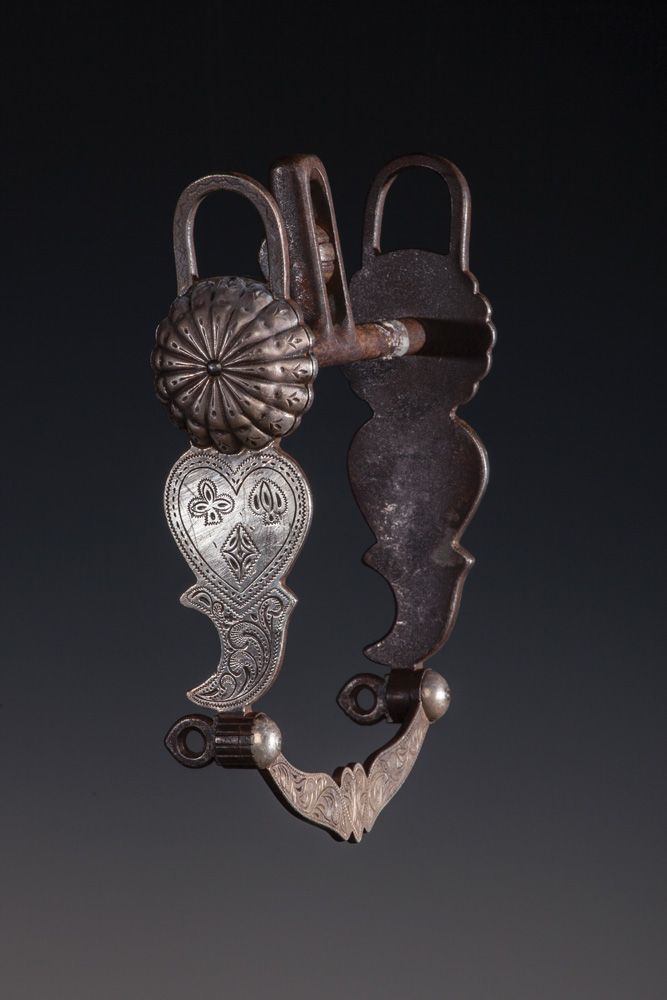 Paulino Card-Suit Pattern Half-Breed Bit. Silver overlaid high half-breed with engraved heart cheeks, jello-mold conchos, and copper inlaid roller. Patterned after a popular Mike Morales pattern with attribution to El Gato's Bob McBride's and his popular silversmith, Ernesto Paulino. Outstanding condition, circa 1960s. PROVENANCE: Dick Powell Collection, Casa Grande, Arizona