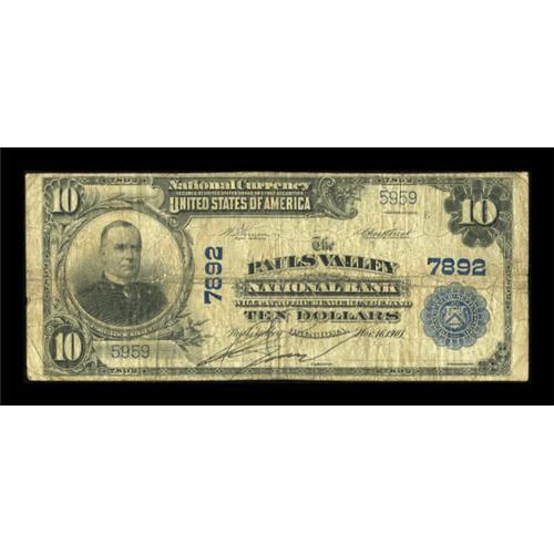 <B>Pauls Valley, OK</B></I> - $10 1902 Plain Back Fr. 626 <B>The Pauls Valley NB</B></I> Ch. # 7892<BR> While small notes are occasionally available from this institution, large examples are another matter entirely, with the current census standing at just three pieces. <B>Very Good,</B></I> with no problems save for even wear. <BR><BR><b>Shipping:</b> Coins & Currency (<a target="_blank" href="http://www.heritageauctions.com/common/shipping.php">view shipping information</a>)