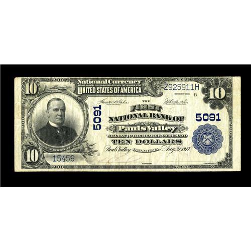 <B>Pauls Valley, OK</B></I> - $10 1902 Plain Back Fr. 632 <B>The First NB</B></I> Ch. # 5091<BR>A more than acceptable large example from this bank, where most all of the large notes known are decidedly low grade. <B>Fine-Very Fine.</B></I><BR><BR><b>Shipping:</b> Coin/Currency (<a target="_blank" href="http://www.heritageauctions.com/common/shipping.php">view shipping information</a>)