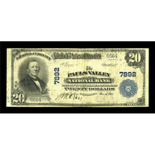 <B>Pauls Valley, OK</B></I> - $20 1902 Plain Back Fr. 652 <B>The Pauls Valley NB</B></I> Ch. # 7892<BR> The cashier's signature is a nicely penned example, while the president's signature is a bit faded. <B>Very Fine </B></I>with light wallet staining.<BR><I>From The Kansas City Collection.</B></I><BR><BR><b>Shipping:</b> Coins & Currency (<a target="_blank" href="http://www.heritageauctions.com/common/shipping.php">view shipping information</a>)