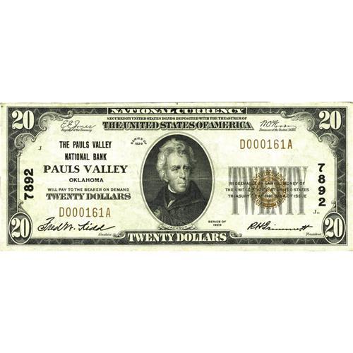 <B>Pauls Valley, OK</B></I> - $20 1929 Ty. 1 <B>The Pauls Valley NB</B></I> Ch. # 7892<BR>An attractive small note which is nice as anything from here listed in the census. Bright <B>Very Fine.</B></I>