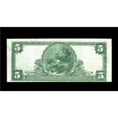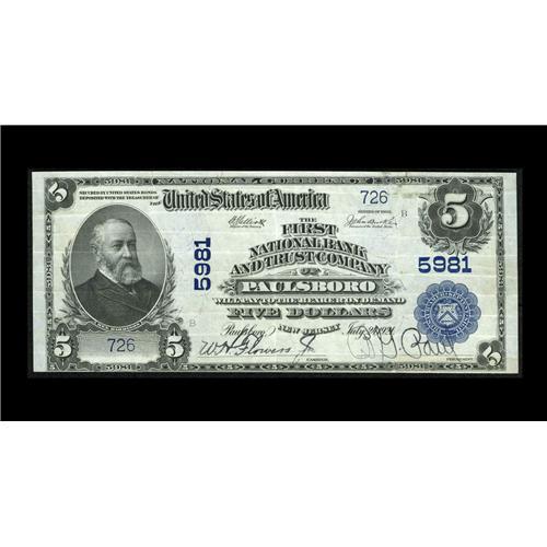 <B>Paulsboro, NJ</B></I> - $5 1902 Plain Back Fr. 607 <B>The First NB & TC</B></I> Ch. # 5981<BR>This note is on the much scarcer second title for this bank. It is bright with stamped signatures of W.H. Flowers Jr and B.G. Paul. It also looks to be of a higher grade at first glance. This $5 did not circulate, but it does have three vertical and ten neatly spaced lateral folds. There is a small top edge tear, too. Still an attractive note on an elusive title. <B>Very Fine.</B></I>