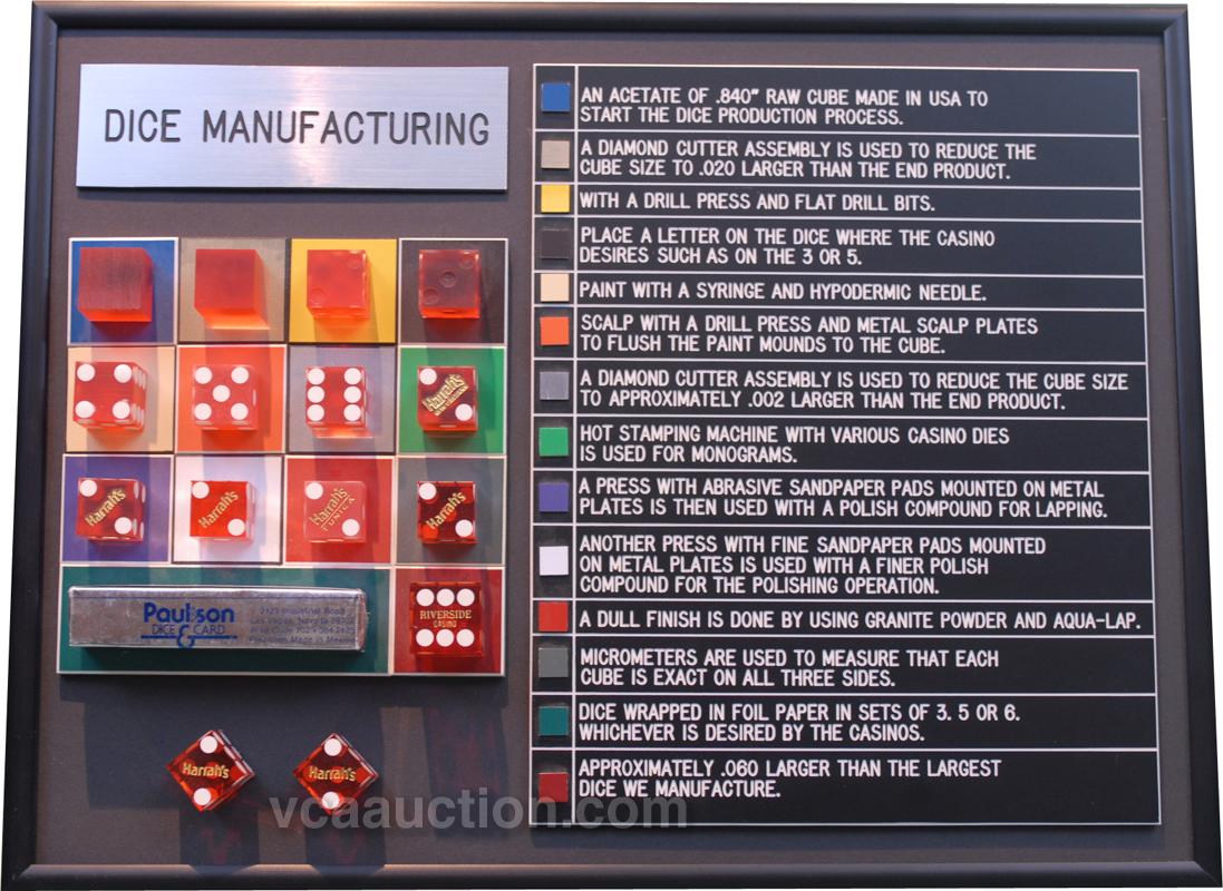 Paulson Dice Making Display – The 17" by 12" framed display depicts the step-by-step process for making casino dice. These were given away as gifts to Paulson’s best customers.