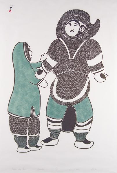 Canadian, Cape Dorset RCA [b. 1916] MOTHER AND SON; 1975 colour stonecut on paper; ed. #37/50 28.5 x 18 in. (72.4 x 45.7 cm) signed, titled, dated & editioned