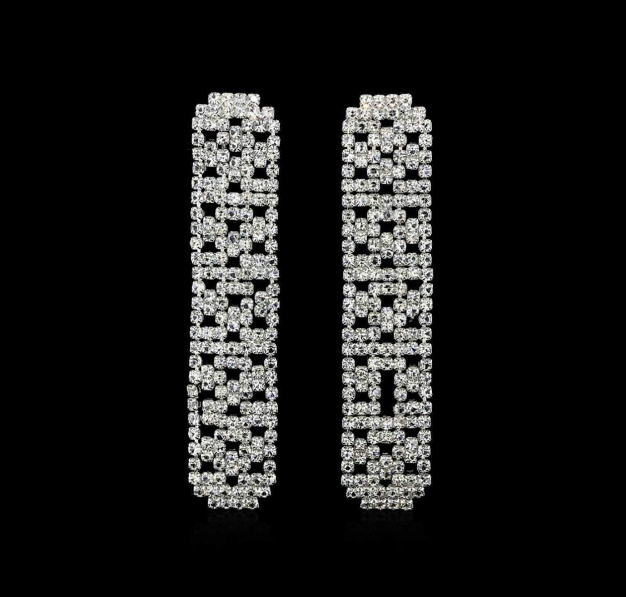 High end designer jewelry. Pave Crystal Rectangle Earrings - Silver Plated. Silver Plated Post Setting. Clear/ Silver. 2.5inches.