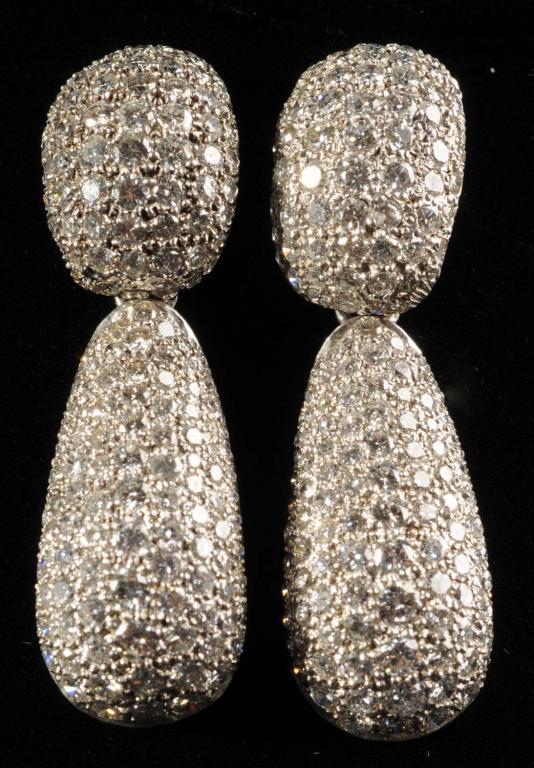310 round brilliant cut diamonds, pave' set in these gorgeous two-piece earrings. These were probably made in the 1960s and hold very fine quality diamonds. The 310 diamonds have an approximate total weight of 8 carats. These stones vary in size from .02 to .04 carats each and have an approximate GIA color and clarity grade range of "G-H/VS1-VS2" and are very well cut and matched. The pave' work is very fine and the stones are set close together. The bottom, tear drop-shaped portion of the earring is easily removable and the top, kidney-shaped section has a post and friction back. The metal is palladium which was used to keep the earrings from being too heavy. Jewelry