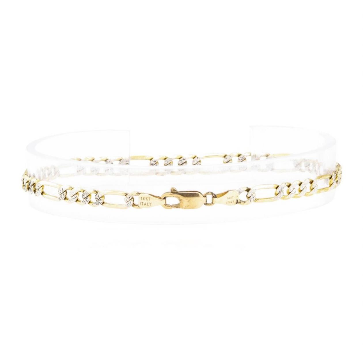 One pave figaro link bracelet measuring approximately eight inches in length and 6mm wide featuring: 14KT yellow gold with rhodium plating weighing 7.3 grams.