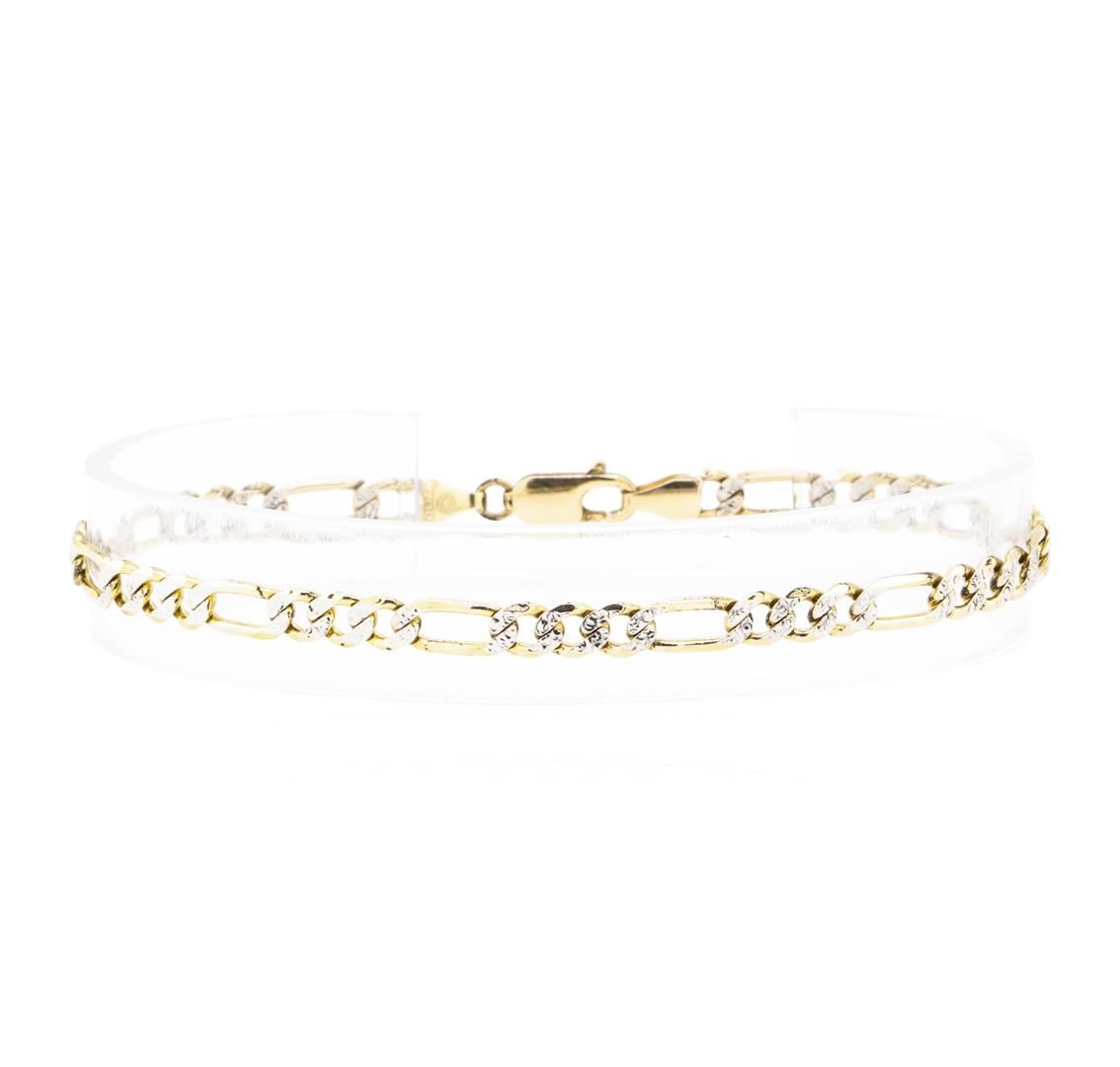 One pave figaro link bracelet measuring approximately eight inches in length and 6mm wide featuring: 14KT yellow gold with rhodium plating weighing 7.3 grams.