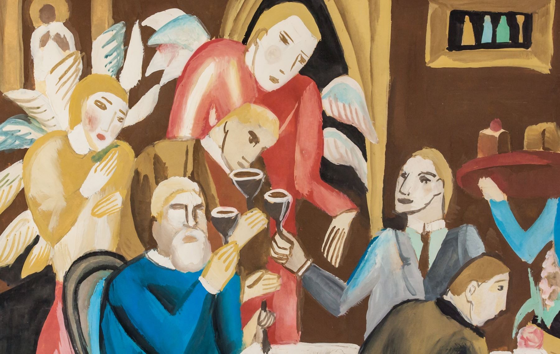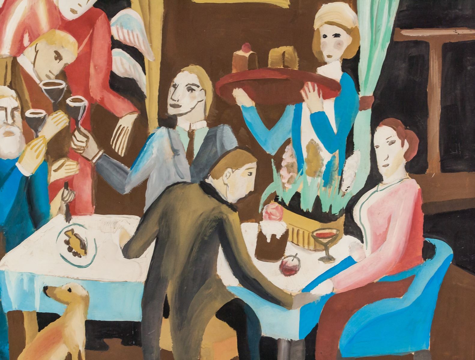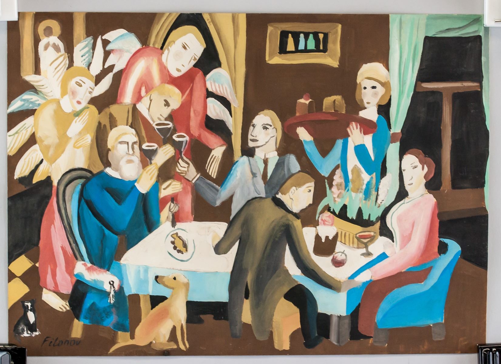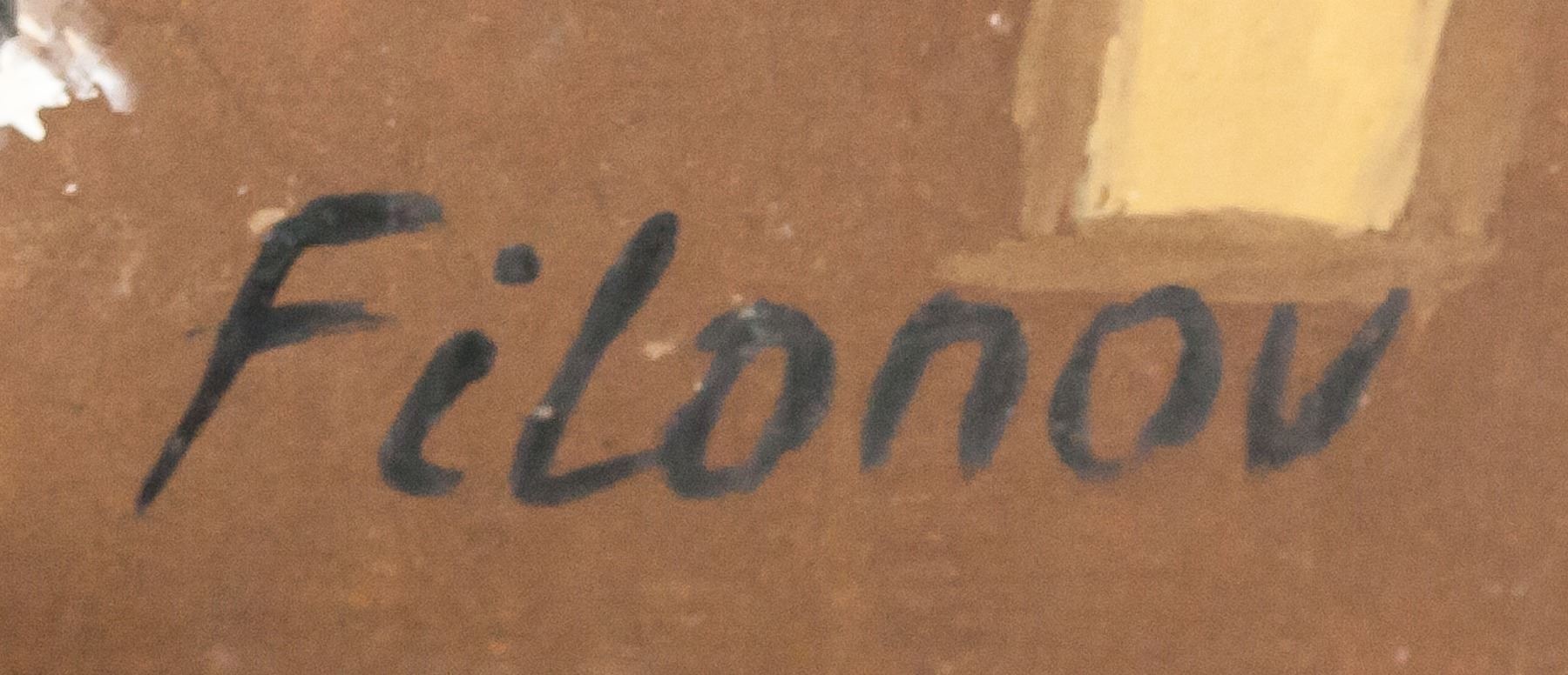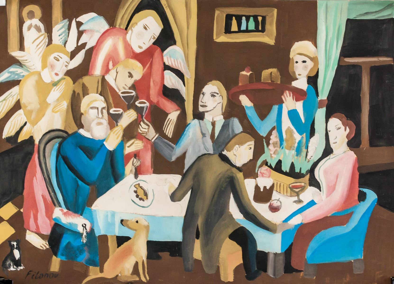 Gouache on paper. Featuring a portrait of a dining scene. Signed Filonov on the lower left corner. Attributed to Pavel Filonov (1883-1941, Russian). 20.5 x 29 cm (8 x 11.5 inches). PROVENANCE: Southern Ontario estate