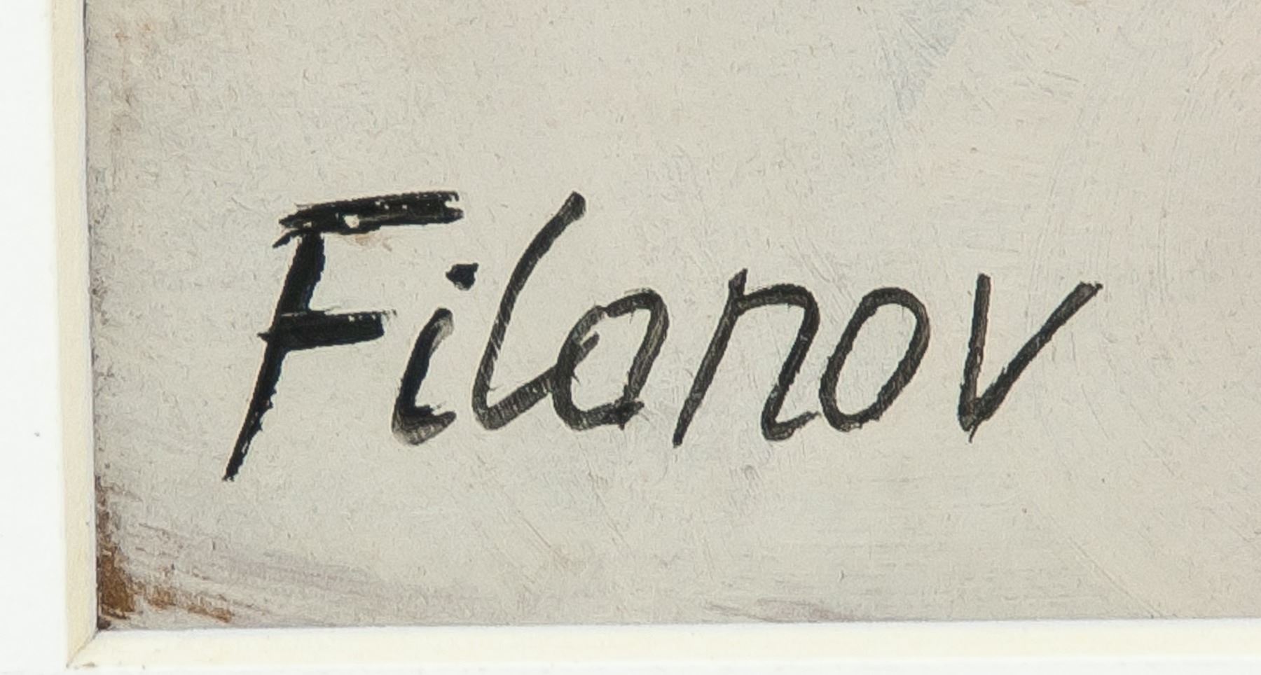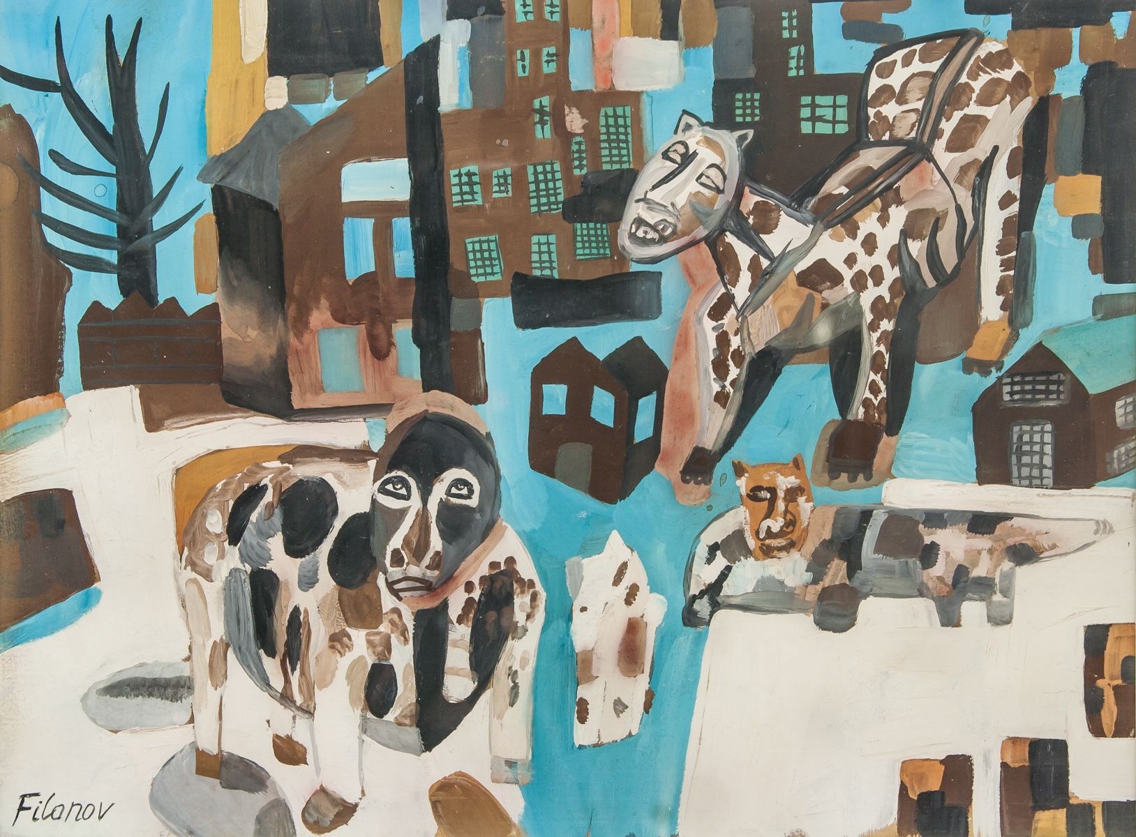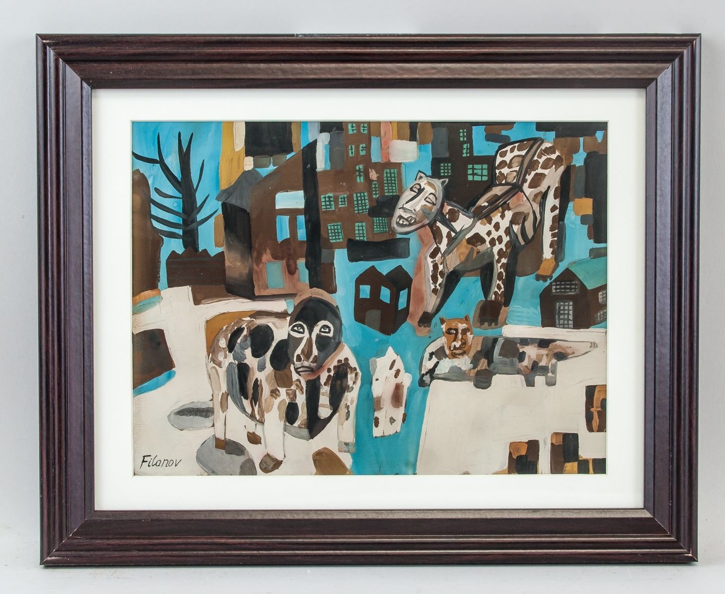 Gouache on paper, newly framed. Featuring a landscape scene of city with surreal animals. Signed Filonov on the lower left corner. Attributed to Pavel Filonov (1883-1941, Russian). 20.5 x 26.5 cm. (8.1 x 10.4 inches). Frame size: 30.5 x 38 cm (12.0 x 15.0 inches). Pavel Nikolayevich Filonov was a Russian avant-garde painter, art theorist, and poet. PROVENANCE: Southern Ontario estate