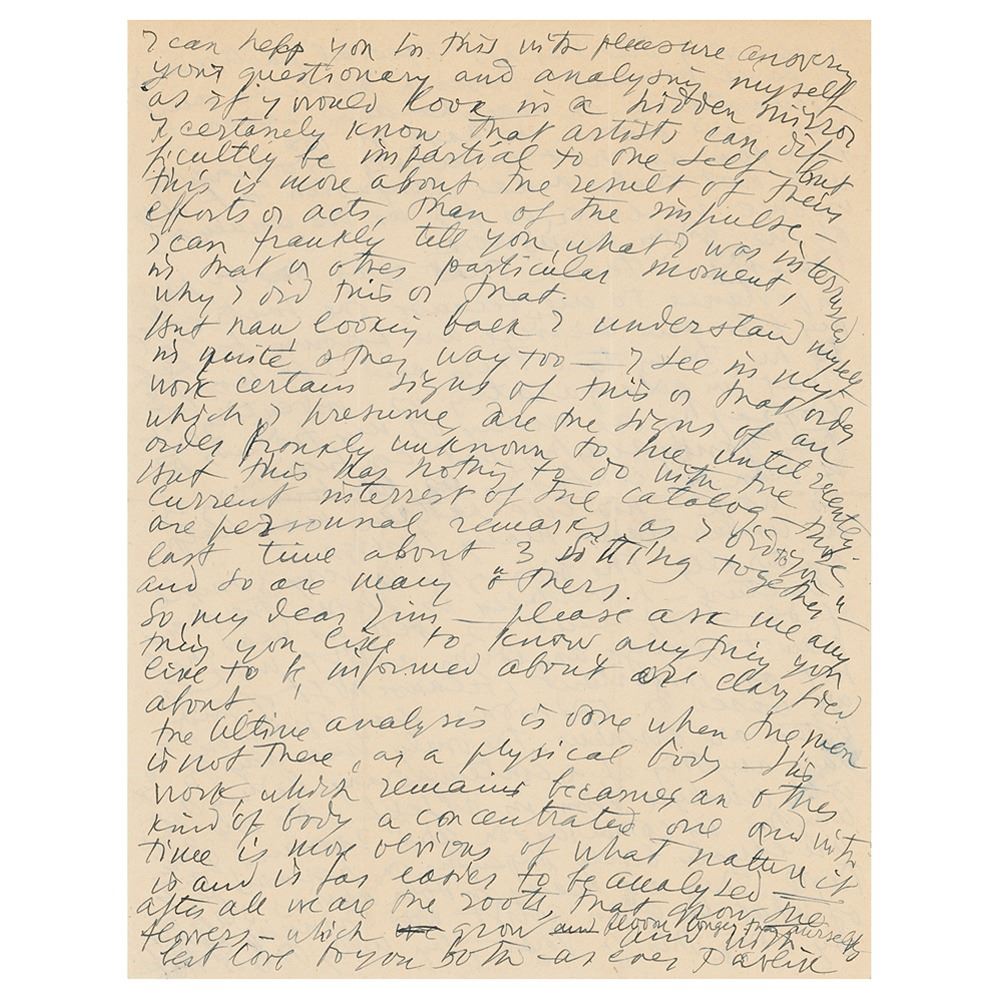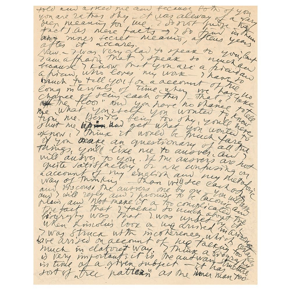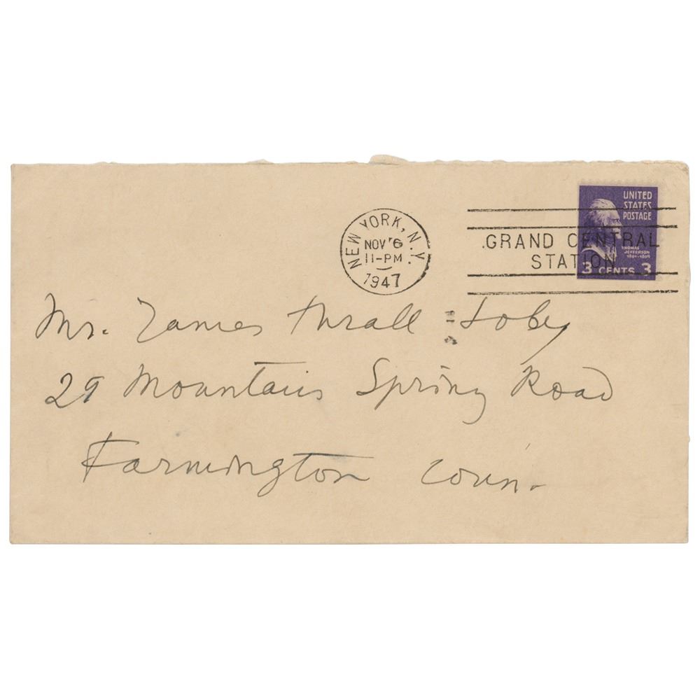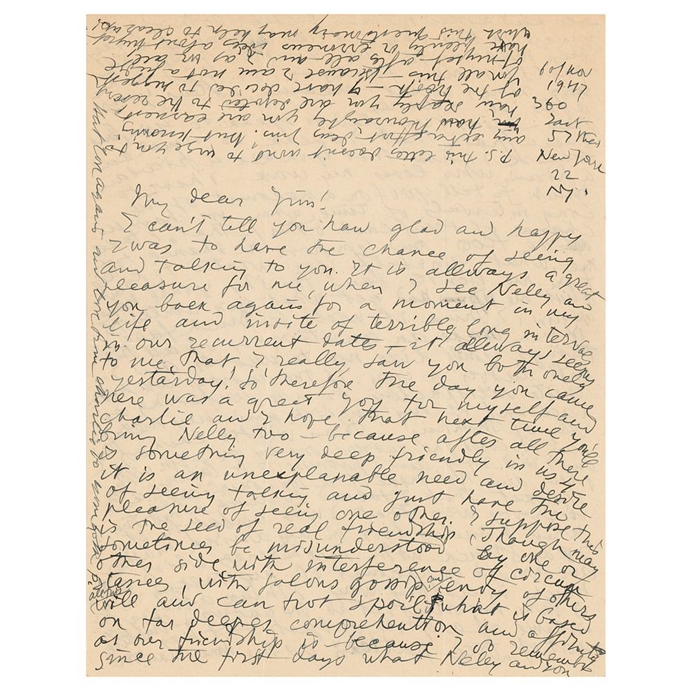 Substantial and scarce ALS, signed “Pavel,†four total pages, 8.5 x 11, November 6, 1947. Lengthy handwritten letter to his biographer James Thrall Soby, (spelling and grammar retained) writing about the importance of his friendship with his correspondent, which begins with an effusive reference to a visit from Soby to see him and his partner, “Charlie,†artist and editor of the Surrealist magazine View, Charles Henri Ford. Tchelitchew continues by noting that he is aware that Soby loves Tchelitchew's painting. “I have so much to tell you on account of the long intervals of time when we have no chance of seing each other…you have no chance to tell me what yourself you wanted to know from me…you'll here shut me up and get what you wanted to know. I think it would be much farer if you make an questionary of all the things you'll like me to answer, and I will answer to you. If the answers are…confusing on account of my english and my metaforic way of thinking—then we'll see each other and discuss the answers one by one…I can help you in that with pleasure answering your questionary and analysing myself…about the biography was that I was upset by it. When Lincoln's book on me arrived…I was struck with incoherences which certainly have arrived on account of me talking too much in elaboret way. I think a biography is very important…it has sort of a tree pattern as the inner man too. So as every tree has his special particularity of development based on directions and circumstances, on drought and rains—sun and moon—so have we to. Therefore an not accurate biography will not only make confusion but will…in error, as far as the analysis of one given man's work…that was of primal importance to me because the facts of my life and carrere are known far better to me than to others and I do not believe that in exagarating or inventing on's biography as many of my friends do they are giving anything but confusion…Naturally the biography is very simple structure…Now to judge an living artist work not as important because most of judgements are based on opinions and opinions often are erroneous. The onely true way to say anything of a contemporary living artists to analyse him in itself—no one gains anything in comparison as if I would look in a hidden mirror…I see in my work certain signs of an order frankly unknown to me until recently…So my dear Jim—please ask me anything you like to know…the work which remains becomes another kind of body, a concentrated one...after all we are the roots that grow our flowers which grow and bloom.†In fine condition. Accompanied by the original mailing envelope addressed by Tchelitchew, who incorporated his signature in the return address on the reverse flap.