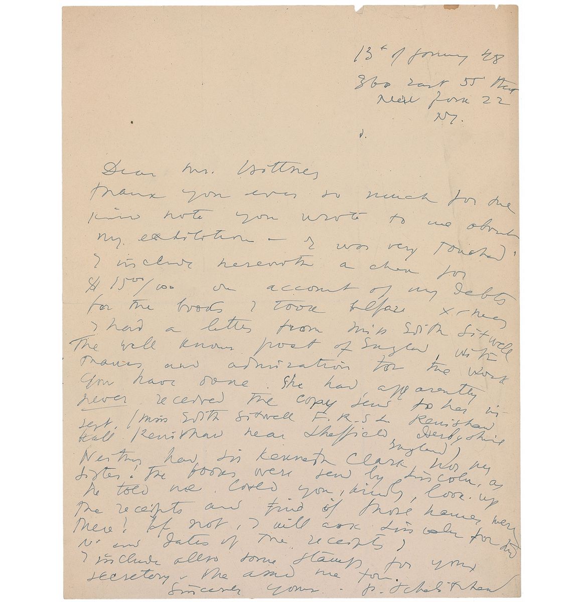 Russian-born painter, set designer, and costume designer (1898-1957), who immigrated to Paris in 1923 and became closely associated with the Neo-romanticism movement. ALS signed “P. Tchelitchew,” one page, 8.5 x 11, January 13, 1948. A letter to the author and book dealer Herbert Bittner, in part: “I enclose herewith a check for $15 on account of my debts for the books I took before X-mas. I had a letter from Miss Edith Sitwell, the well known poet of England, with thanks and admiration for the work you have done. She had apparently never received the copy sent to her in Sept…Neither has Mr. Kenneth Clark, nor my sister!…Could you, kindly, look up the receipts and find if those names were there?” Intersecting mailing folds, a diagonal crease to right side, a small stain to upper right, and a few small edge tears, otherwise fine condition.
