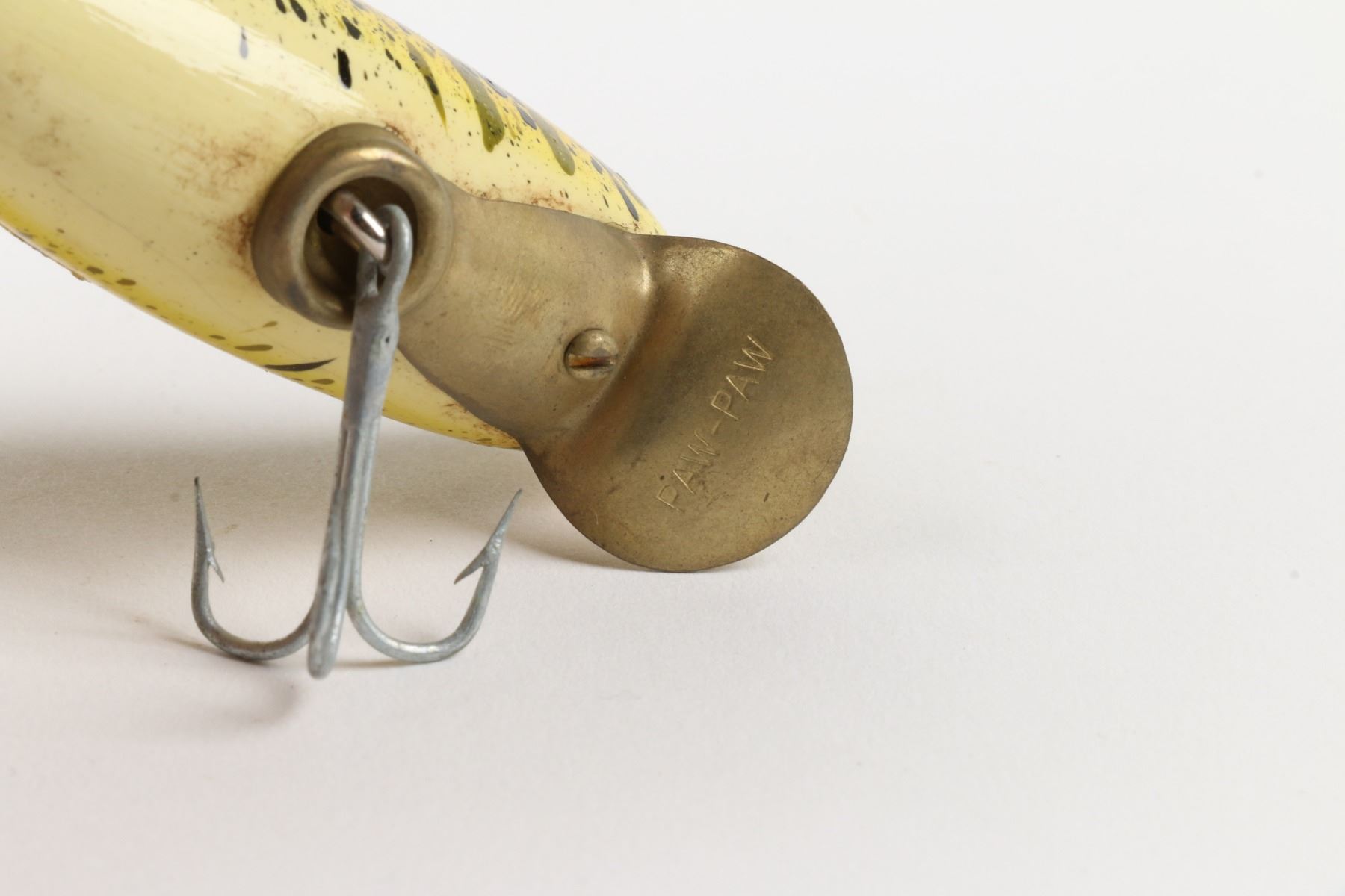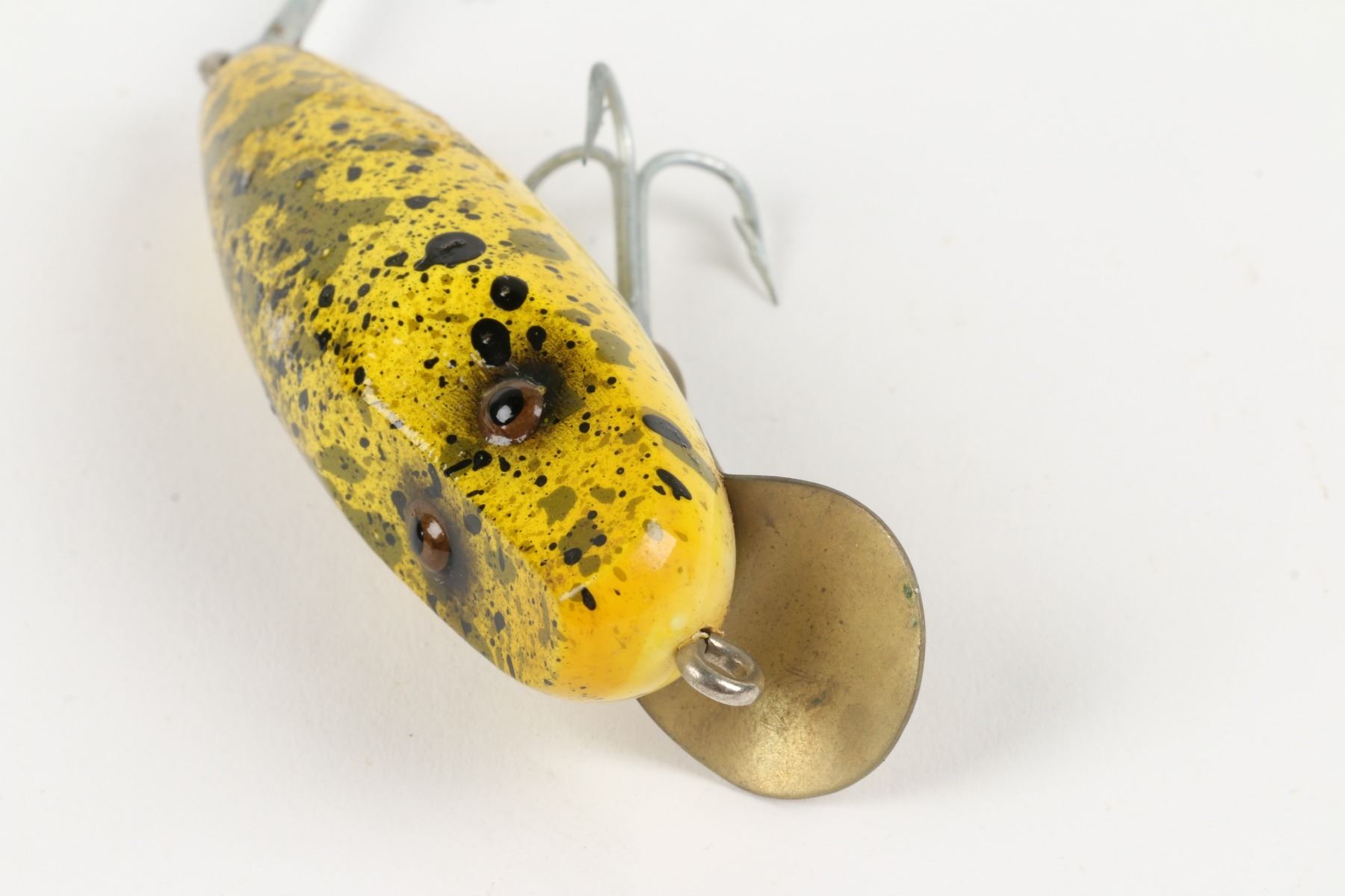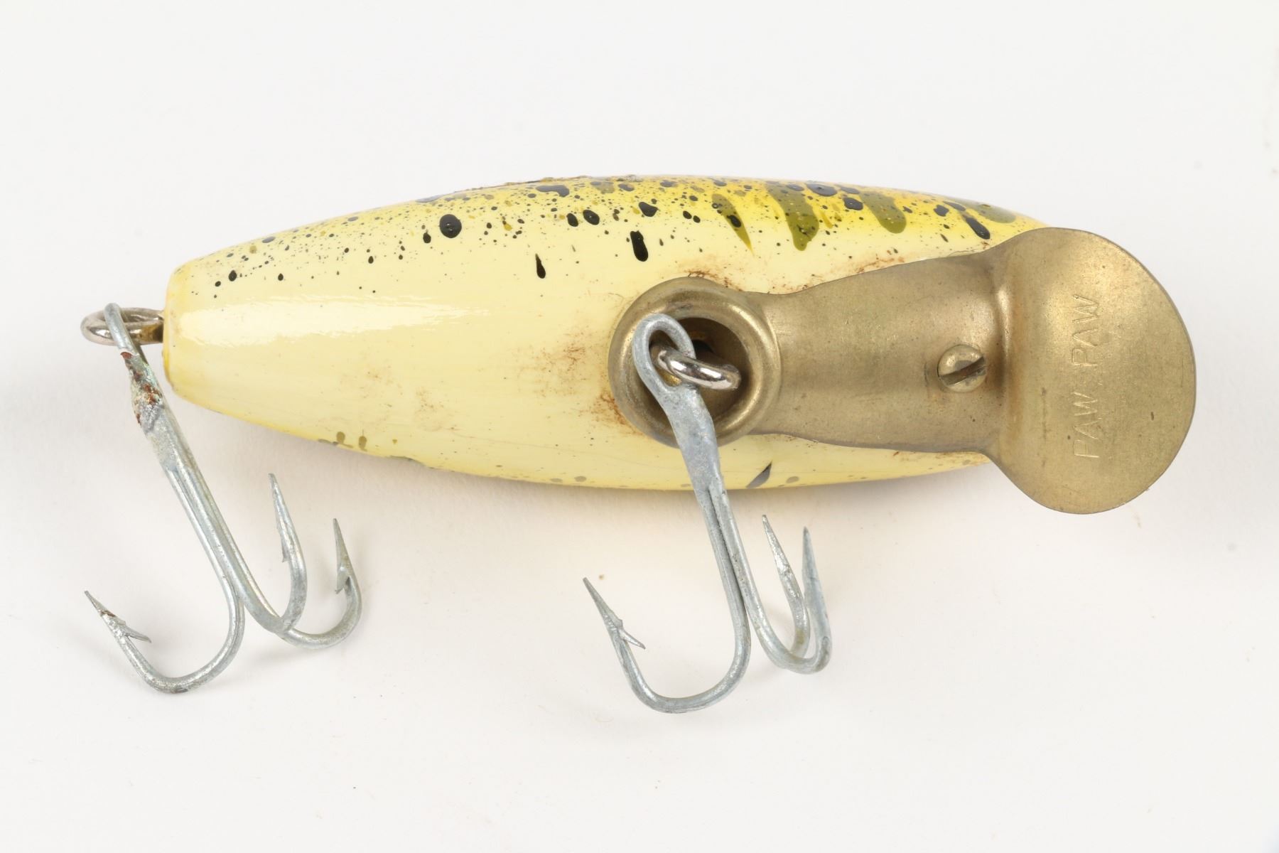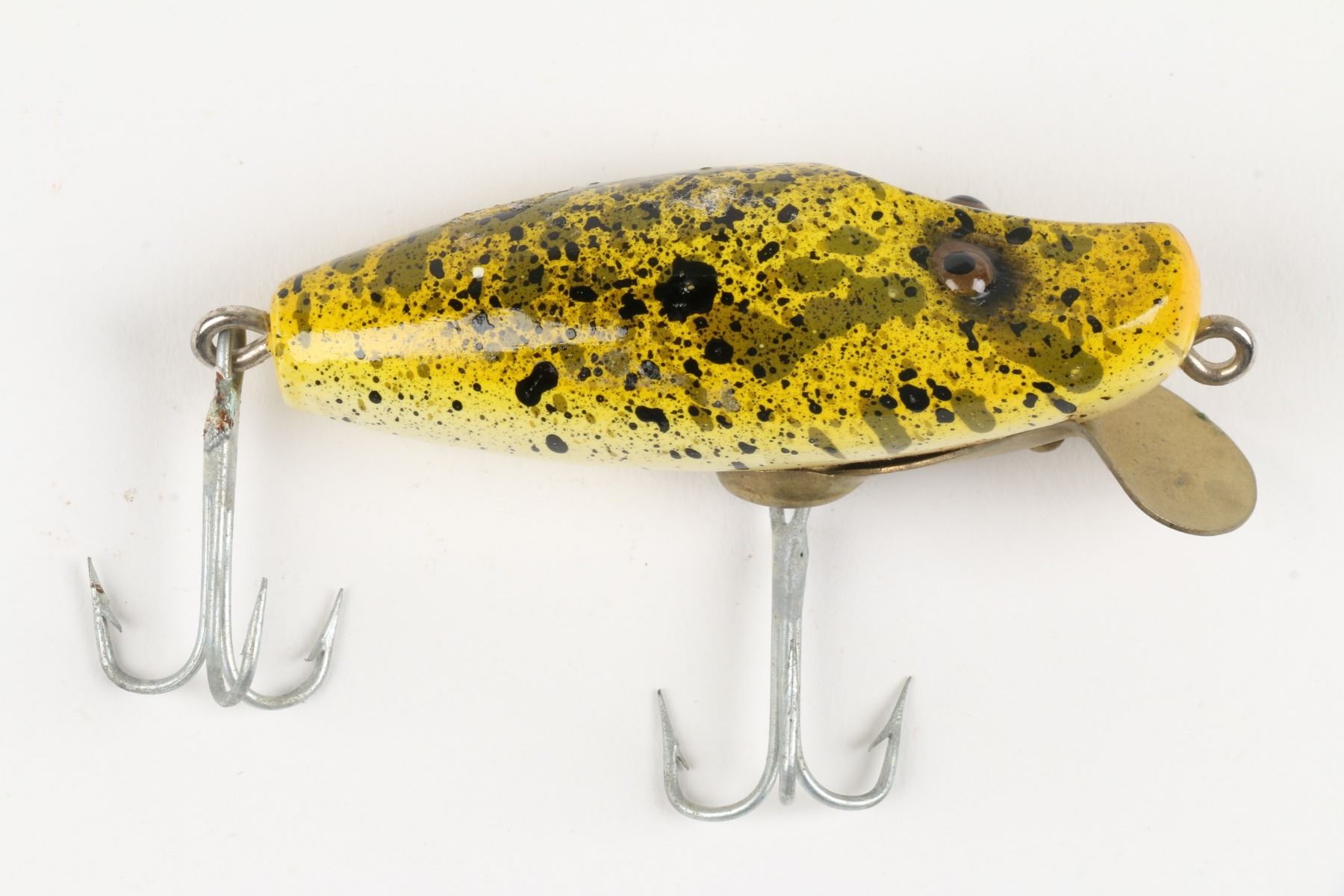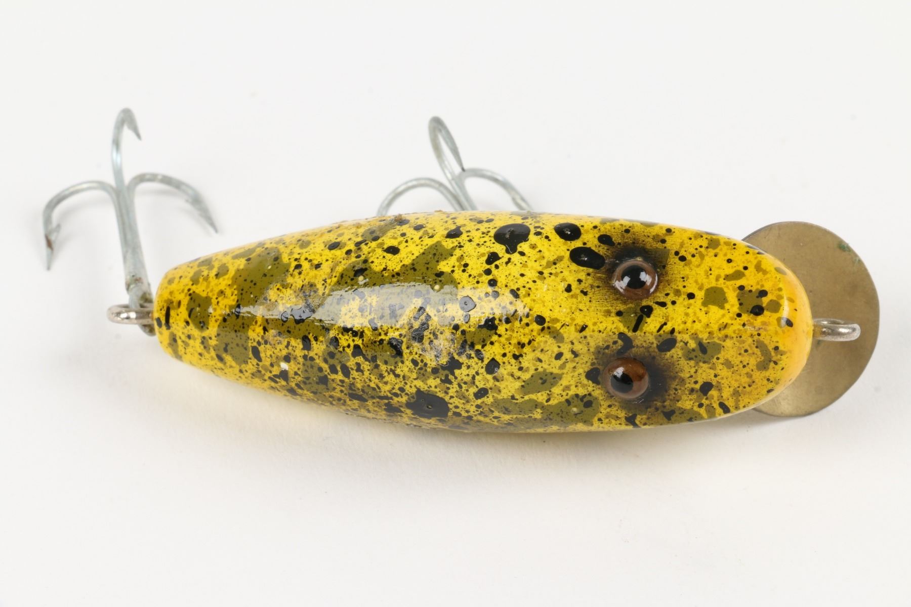 Paw Paw Bait Company, United States. 1940s. Frog Splatter. Material: Wood. Quantity: 1. Grade: VG+. 2.5". Est. $75-100.
