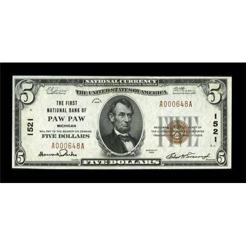 <B>Paw Paw, MI</B></I> - $5 1929 Ty. 1 <B>The First NB</B></I> Ch. # 1521<BR> A desirable note in a tough grade. <B>Choice Crisp Uncirculated</B></I> with one of the better town names sought after by National collectors. A little margin disturbance along the top margin limits the grade, otherwise it is quite original.<BR><BR><b>Shipping:</b> Coins & Currency (<a target="_blank" href="http://www.heritageauctions.com/common/shipping.php">view shipping information</a>)