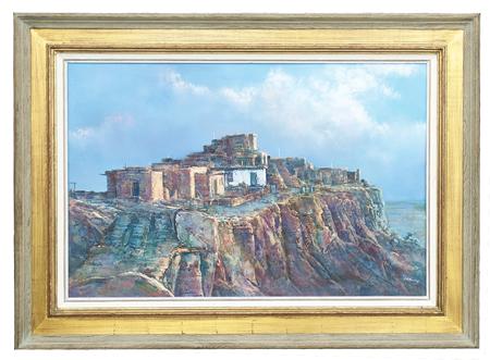 Circa Late 1900s, Signed original oil on board - "Walpi" (First Mesa, Hopi, AZ). 24" x 36" (33" x 45") From the Millican Collection.