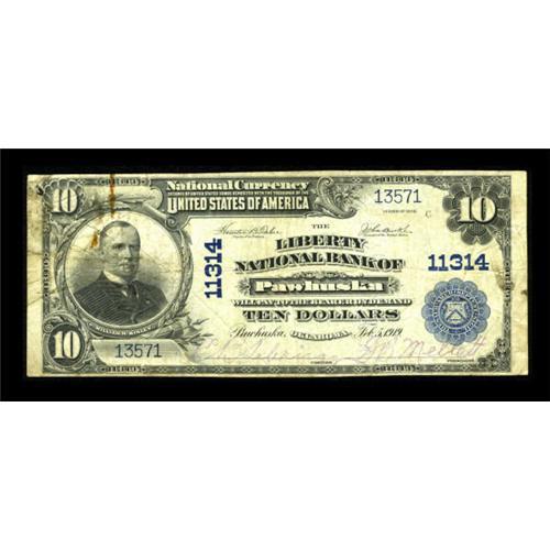 <B>Pawhuska, OK</B></I> - $10 1902 Plain Back Fr. 632 <B>The Liberty NB</B></I> Ch. # 11314<BR> Large notes only from this Pawhuska bank, with this piece among the eight reported. <B>Fine, </B></I>with a paper clip stain that does detract a bit. <BR><BR><b>Shipping:</b> Coins & Currency (<a target="_blank" href="http://www.heritageauctions.com/common/shipping.php">view shipping information</a>)