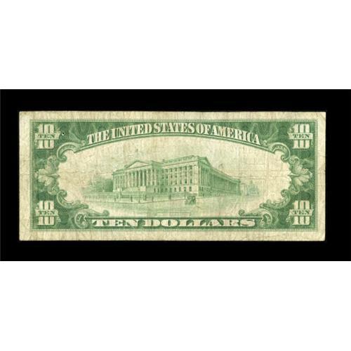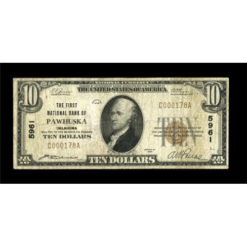 <B>Pawhuska, OK</B></I> - $10 1929 Ty. 1 <B>The First NB</B></I> Ch. # 5961<BR> A very scarce bank in small size, no doubt due to this institution's early exit as a victim of the Depression in March of 1931. Just four Series 1929 notes comprise the entire census from here, with this piece new to that listing. <B>Fine.</B></I><BR><BR><b>Shipping:</b> Coins & Currency (<a target="_blank" href="http://www.heritageauctions.com/common/shipping.php">view shipping information</a>)