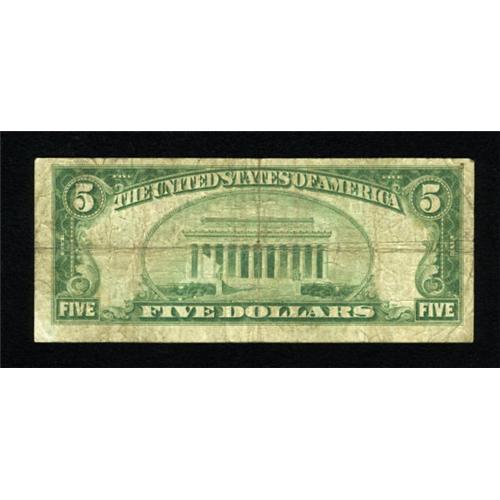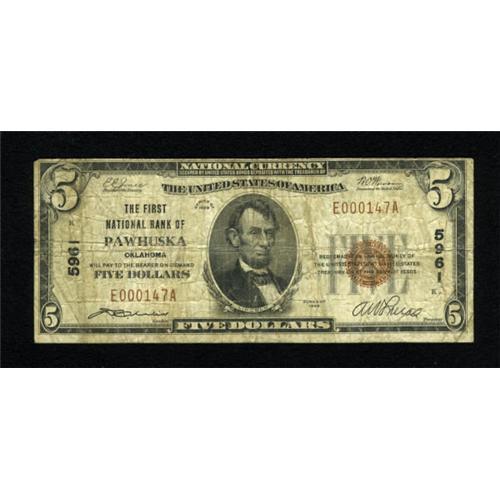 <B>Pawhuska, OK</B></I> - $5 1929 Ty. 1 <B>The First NB</B></I> Ch. # 5961<BR> A very scarce bank in small size, no doubt due to this institution's early exit as a victim of the Depression in March of 1931. Just five Series 1929 notes compose the entire census from here, with this piece new to that listing. <B>Very Good</B></I>. <BR><I>From The Rolling Plains Collection</B></I><BR><BR><b>Shipping:</b> Coins & Currency (<a target="_blank" href="http://www.heritageauctions.com/common/shipping.php">view shipping information</a>)