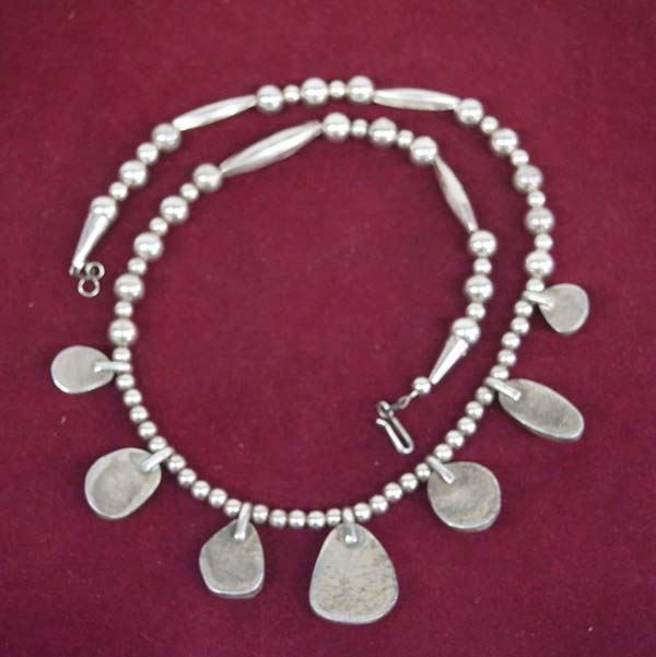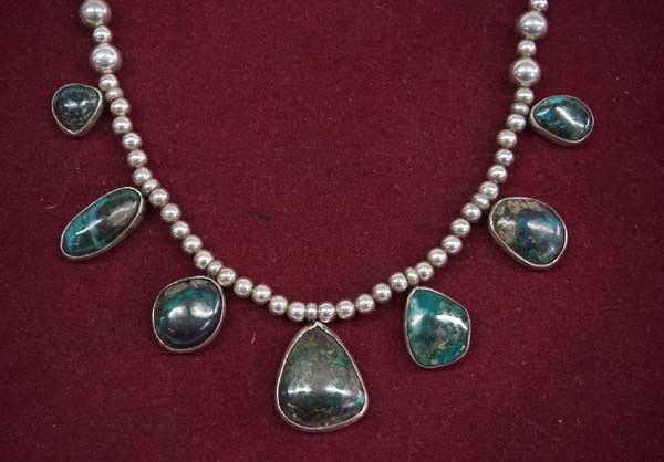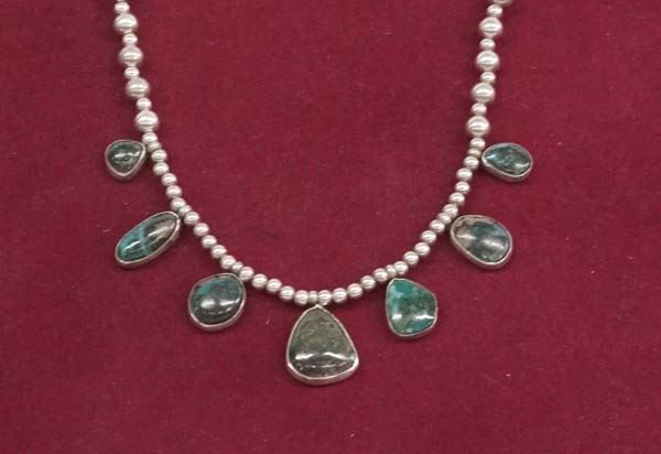 Pawn Native American Navajo Sterling Manassa Turquoise Necklace. Early Navajo Necklace has been restrung. This piece has 7 Natural Dark Green Manassa Turquoise Cabochons. Measures 22'' end to end. Center pendant is 1'' long and all beads are Sterling Silver. Total weight is 51.09g
