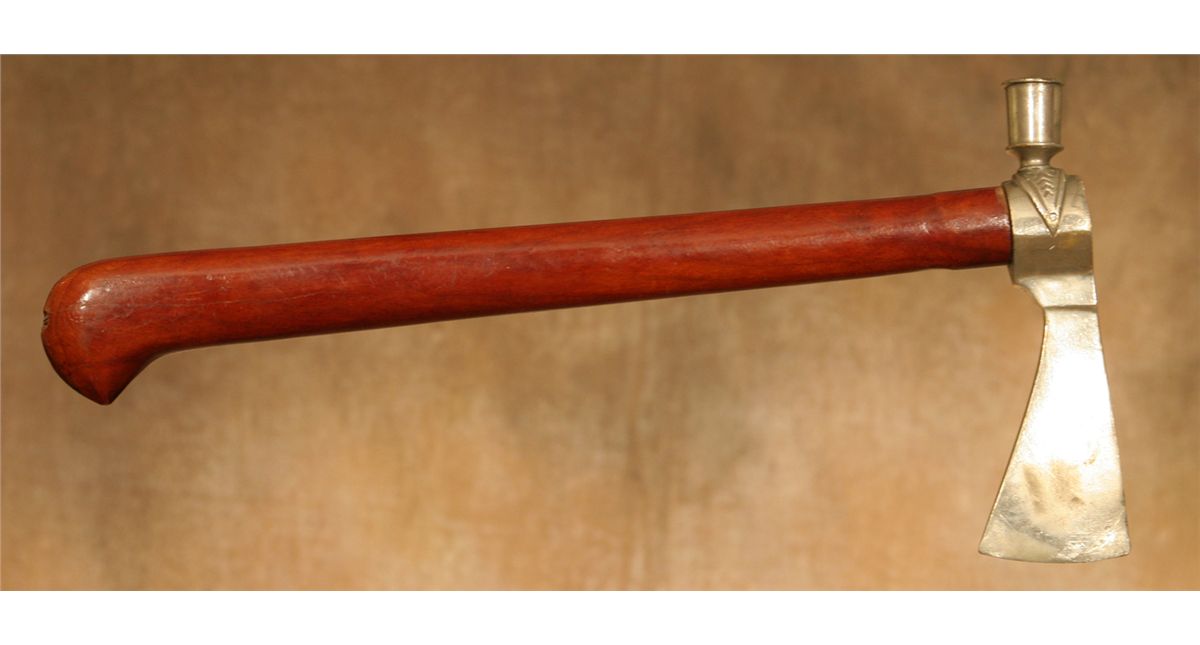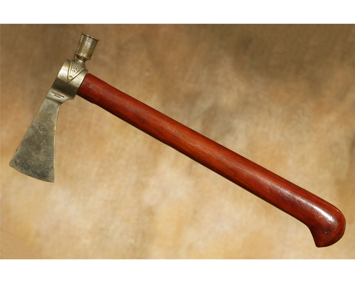 Pawnee Pipe Tomahawk made by William Horstmann (Philadelphia, PA.) 7.5" head is expertly crafted, nickel plated & bears the Horstmann touch mark on the blade. The highly polished 16" haft features a unique, over-sized under-curl at the smoking tip. Circa 1880-1890.Pipe tomahawks attributed to known makers are rare. Horstmann created knives, swords, axe heads and other iron implements that were traded and sold to the Pawnee and Osage Indians in the late 19th century in KS and OK. All Horstmann-made pieces feature this same exact haft. An identical example can be seen at the Museum of the Fur Trade in Chadron, Nebraska; and in the Museum of the American Indian, Heye Foundation which is pictured in Harold Peterson's book American Indian Tomahawks (1965), figure 231.