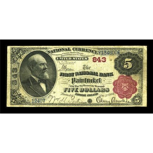 <B>Pawtucket, RI</B></I> - $5 1882 Brown Back Fr. 467 <B>The First NB</B></I> Ch. # 843<BR> First Charters and Brown Backs only from this better Rhode Island bank which liquidated in 1900. Pen signed <B>Fine+++.</B></I><BR><I>From The Walla Walla Collection</B></I><BR><BR><b>Shipping:</b> Coins & Currency (<a target="_blank" href="http://www.heritageauctions.com/common/shipping.php">view shipping information</a>)
