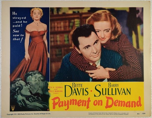 Payment on Demand (Gwenaud Productions, RKO Radio Pictures, 1951) lobby card. Drama, Romance. Starring Bette Davis, Barry Sullivan, Betty Lynn, Peggie Castle, Jane Cowl, Kent Taylor, Walter Sande, Brett King. Directed by Curtis Bernhardt. Very minor edge wear, very minor creases. Near Mint. (11"x14").