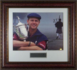 He won eleven Tour events, including the 1989 PGA Championship and the U.S. Open in 1991 and 1999. He was a two-time winner of the Hassan II Trophy in Morocco. At the time of his death, he was ranked third on the all-time money list and in the top 10 of the Official World Golf Rankings—he had been ranked in the top 10 for almost 250 weeks, from 1986 to 1993 and again in 1999. This is an Unsigned 11X14 Tribute photograph featuring Payne Stewart hugging his 1999 US Open Trophy with bag piper in the distance. Custom Leather Framed and Matted.