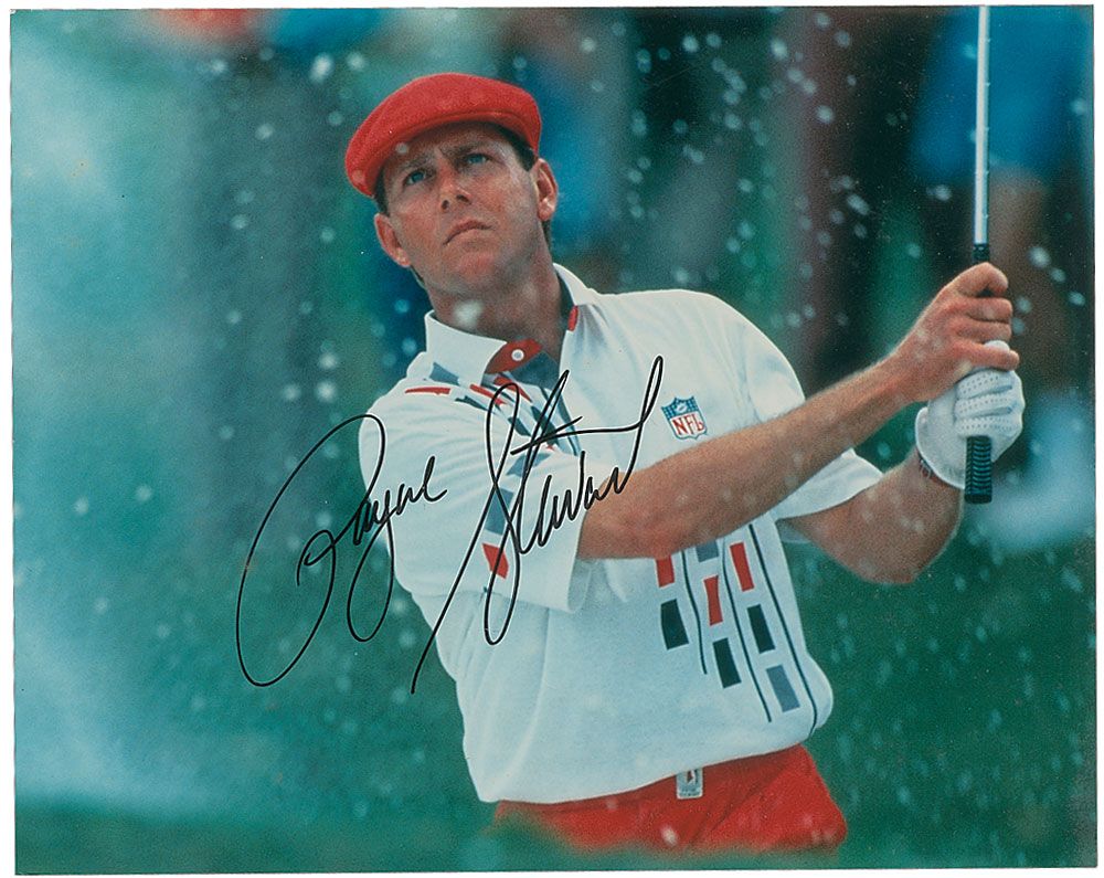 American golfer (1957–1999) who won three major tournaments before dying of hypoxia when the Learjet in which he was flying gradually lost cabin pressure, killing all six aboard, and crashed, unmanned, in a field in South Dakota. Color glossy 10 x 8 photo of Stewart following his shot out of the sand, signed in black felt tip. Photo is affixed to an identical size board. In fine condition.