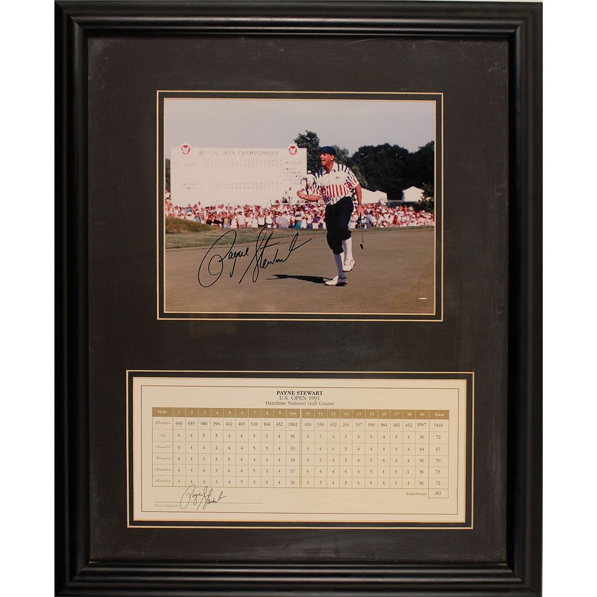 American golfer (1957–1999) who won three major tournaments before dying of hypoxia when the Learjet in which he was flying gradually lost cabin pressure, killing all six aboard, and crashed, unmanned, in a field in South Dakota. Color glossy 10 x 8 photo of Stewart celebrating his winning putt at the 1991 US Open at Hazeltine, signed in black felt tip. Double matted and framed with a printed scorecard from the tournament, bearing a pre-printed Stewart signature, to an overall size of 17.75 x 22. In fine condition.