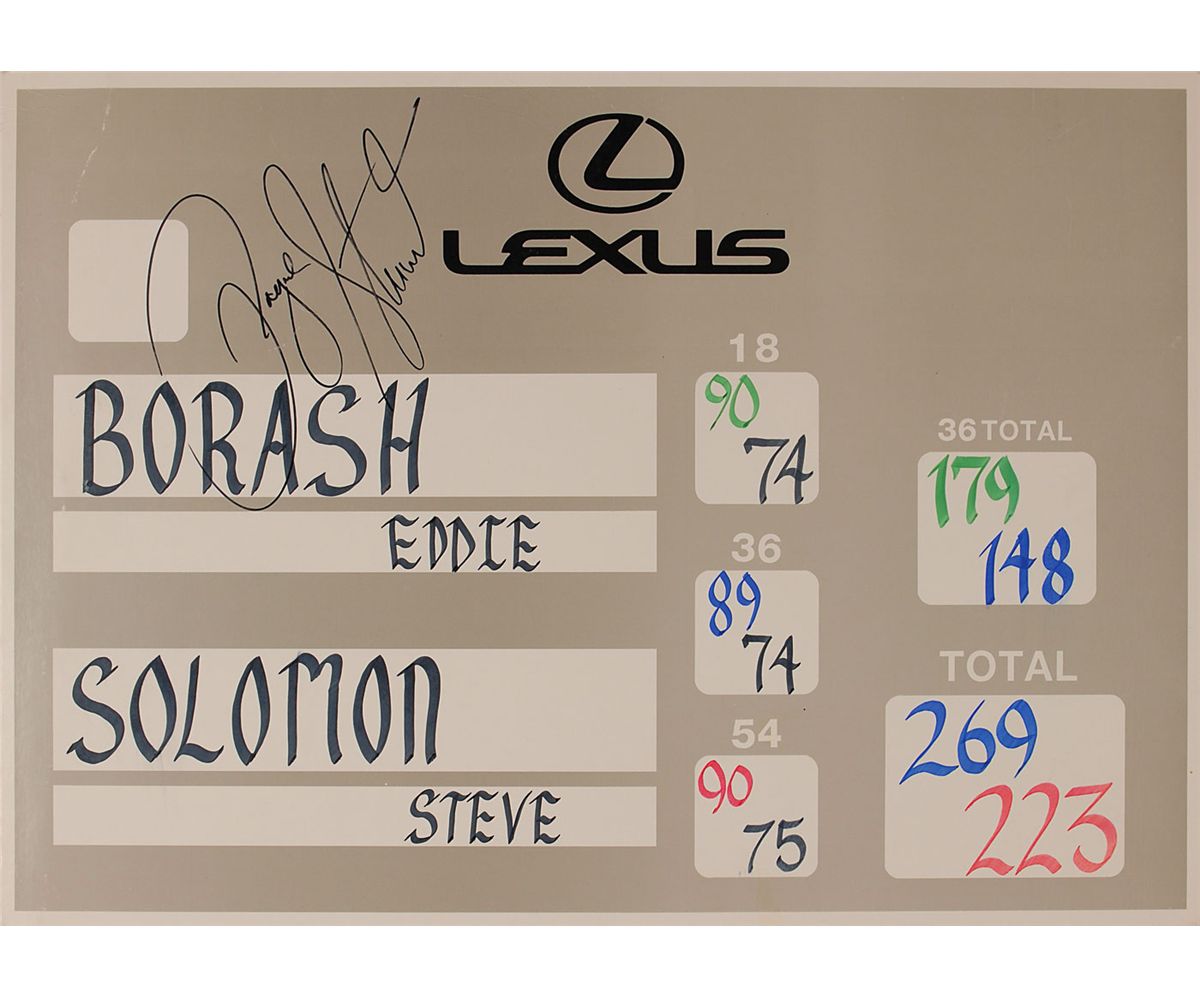 Oversized leaderboard golf paring scorecard, 20 x 14, boldly signed in the upper left in black felt tip by Stewart. Some scattered creases, otherwise fine condition. This is an actual numeral which was used to post standings on a PGA tournament leaderboard.