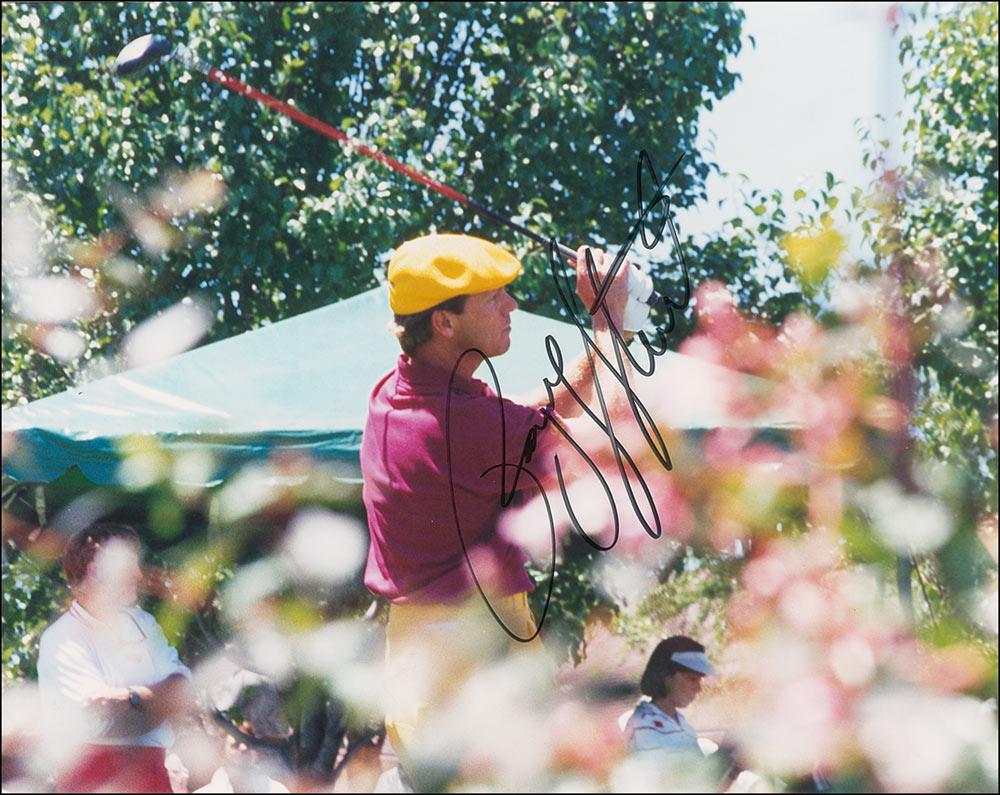 Color glossy 10 x 8 candid photo of Stewart teeing off on the course, signed in black felt tip. In fine condition.
