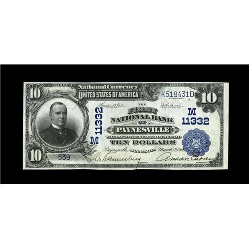 <B>Paynesville, MN</B></I> - $10 1902 Plain Back Fr. 632 <B>The First NB</B></I> Ch. # (M)11332<BR>This nice <B>Crisp Uncirculated</B></I> note is one of a small group from here that has now been quite widely dispersed. We sold this bright pen signed note in our 2004 Central States Numismatic Society Signature Sale for $840. It will do at least as well tonight.<BR><BR><b>Shipping:</b> Coin/Currency (<a target="_blank" href="http://www.heritageauctions.com/common/shipping.php">view shipping information</a>)