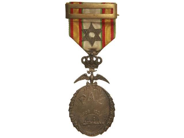 Paz de Marruecos. - 1927. - AR. Medalla ovalada, encima paloma de la Paz y todo pendiente de corona real. Corona, anilla, cinta y sello de Salomón y prendedor originales. Pátina. PG-828. EBC. - -