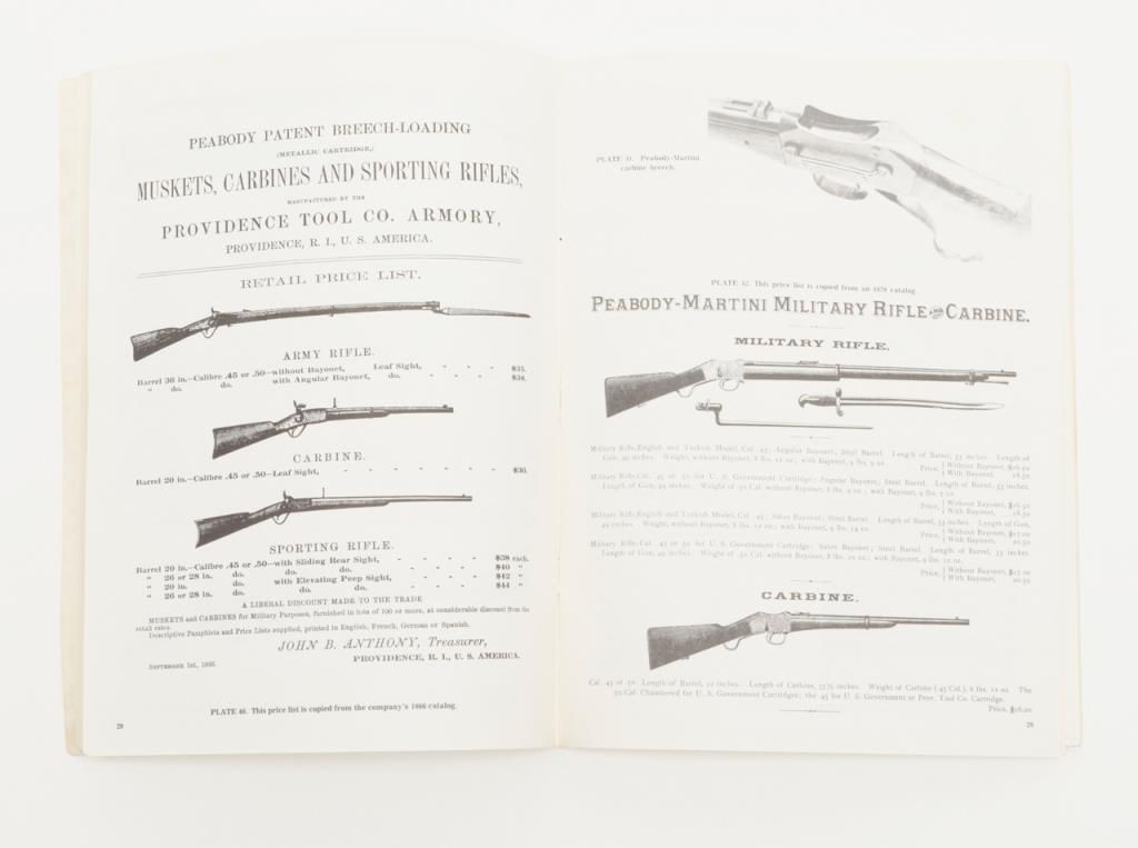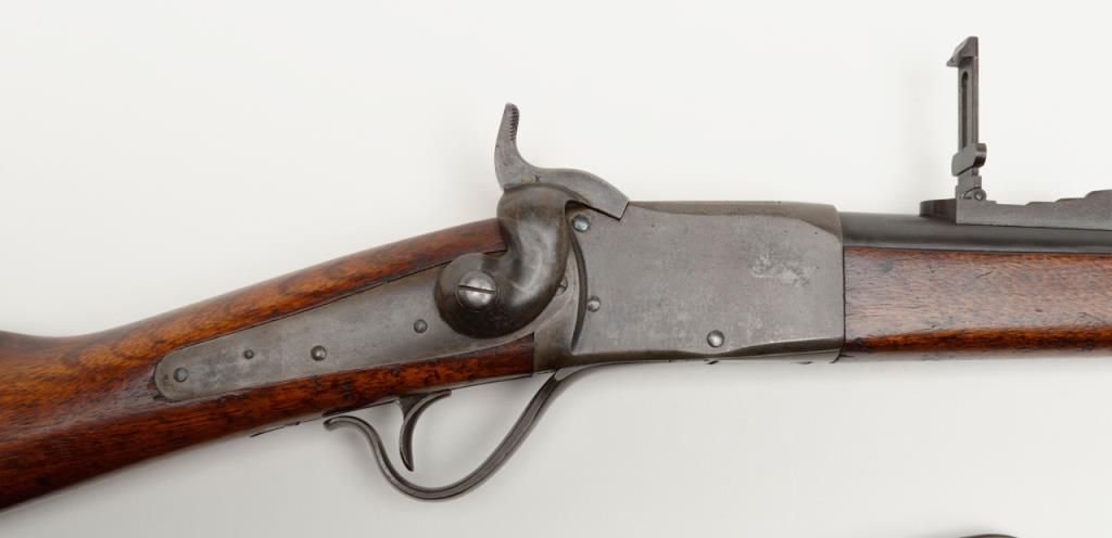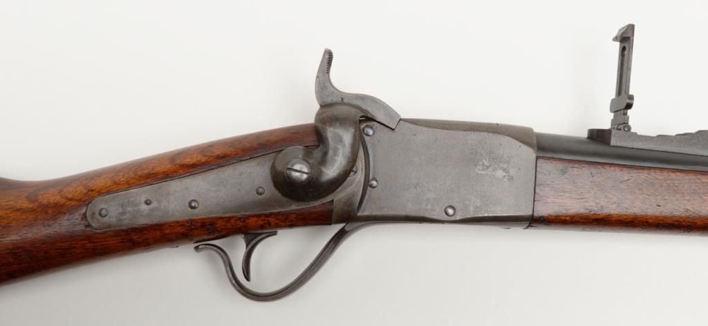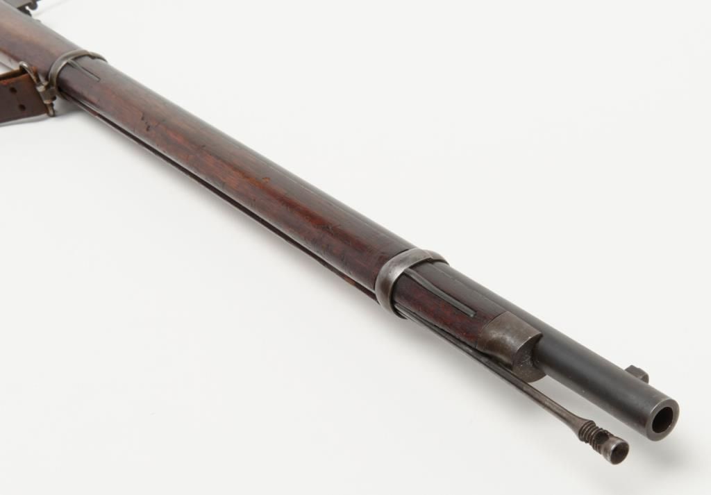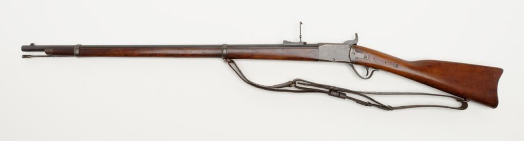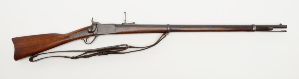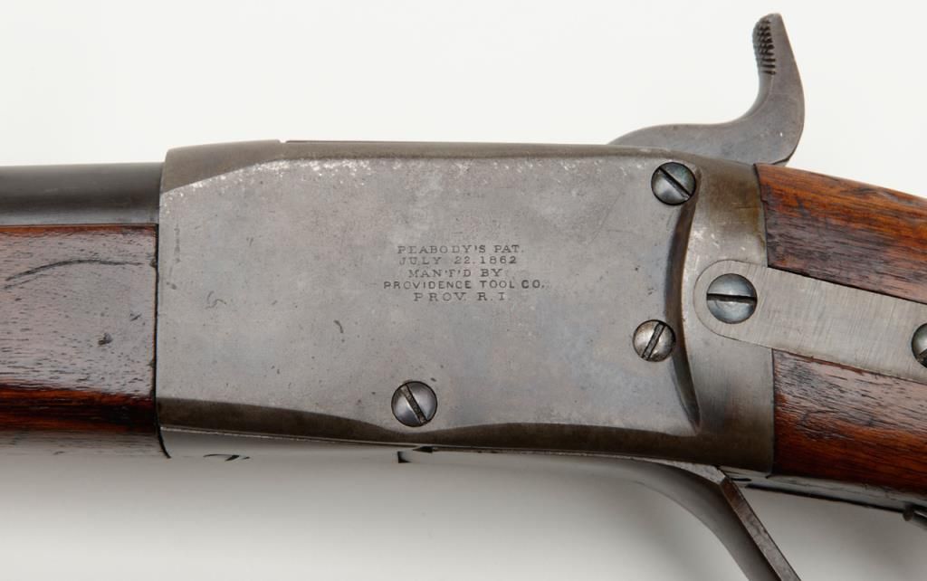 Peabody breech loading rifle, .43 Spanish cal., 33” round barrel, blue and case hardened finish, full wood stocked, later military leather sling, #NVSN in overall very good to near fine condition showing the majority of its original blue and case colors; fine bore, crisp action, good markings and overall very good wood butt stock and forend; iron cleaning rod maintained; manufactured by the Providence Tool Co. circa 1866-71, total quantity approx. 116,000 per Flayderman’s; the greatmajority of production was for foreign contracts. Accompanied by a copy of Ed Hull’s definitive work, Providence Tool Co. Military Arms. (Antique). Est.: $800-$1,600.