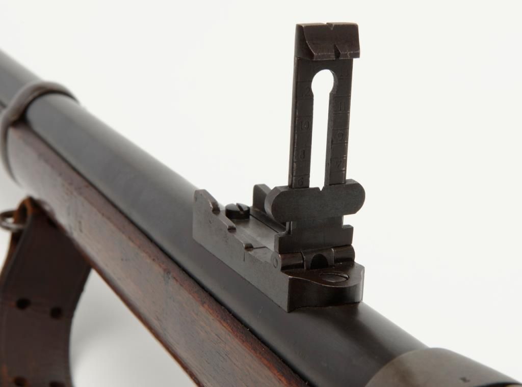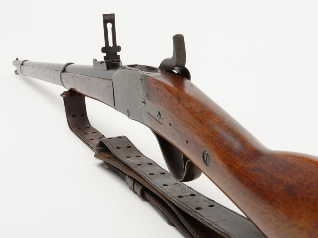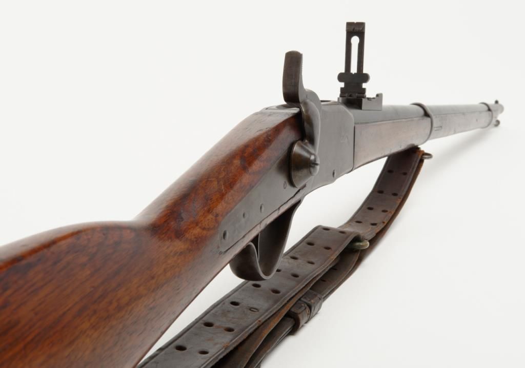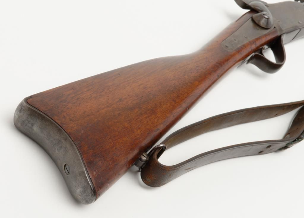 Peabody breech loading rifle, .43 Spanish cal., 33” round barrel, blue and case hardened finish, full wood stocked, later military leather sling, #NVSN in overall very good to near fine condition showing the majority of its original blue and case colors; fine bore, crisp action, good markings and overall very good wood butt stock and forend; iron cleaning rod maintained; manufactured by the Providence Tool Co. circa 1866-71, total quantity approx. 116,000 per Flayderman’s; the greatmajority of production was for foreign contracts. Accompanied by a copy of Ed Hull’s definitive work, Providence Tool Co. Military Arms. (Antique). Est.: $800-$1,600.