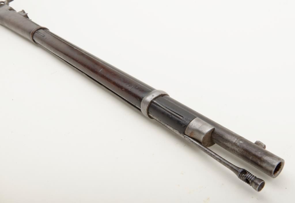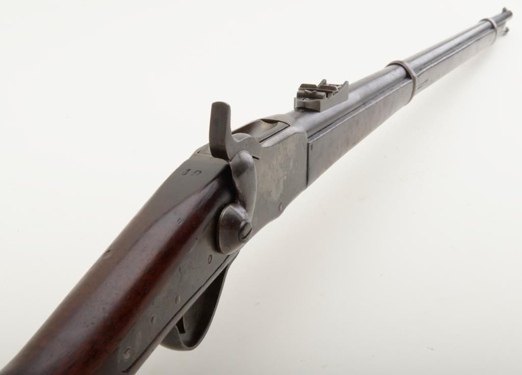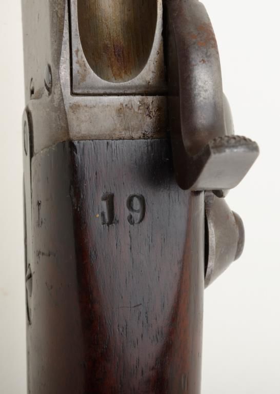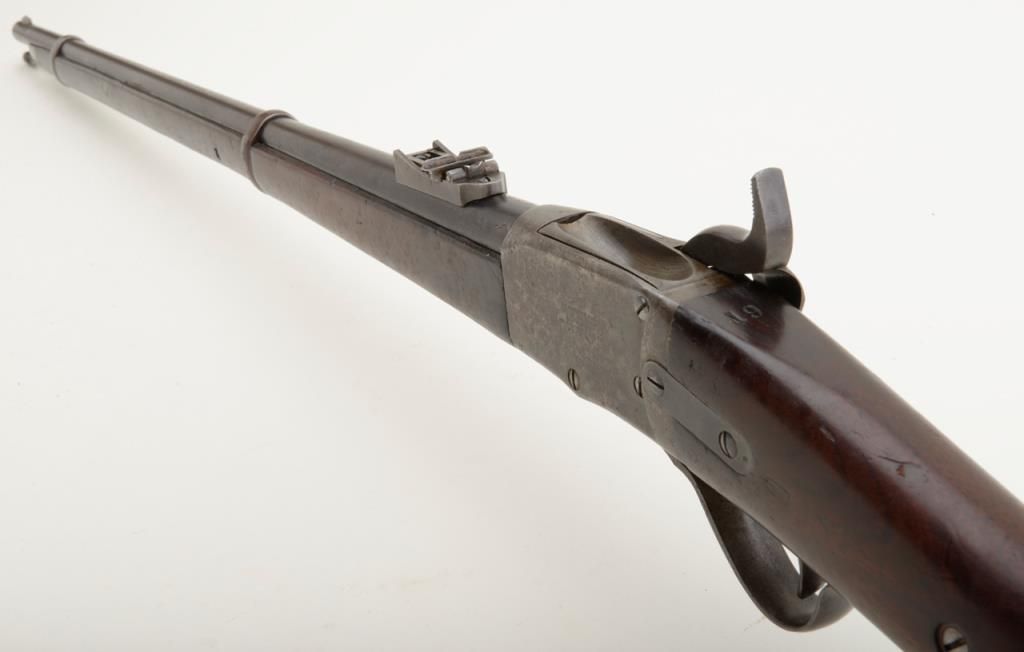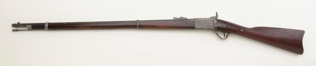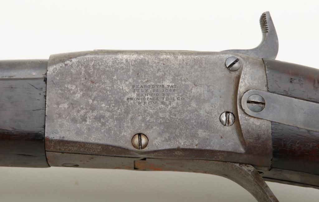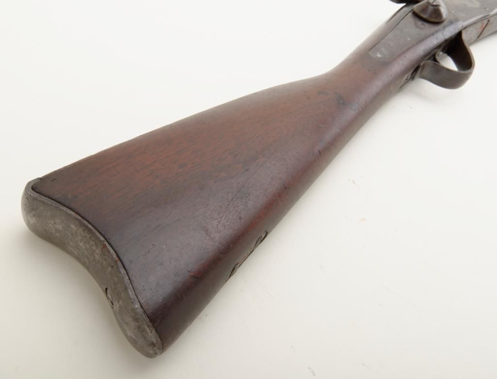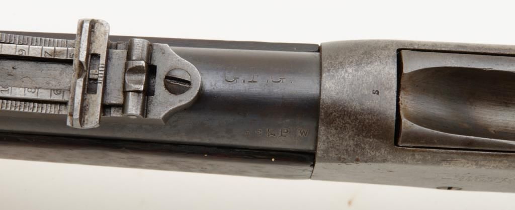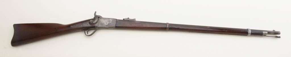 Peabody breech loading single shot rifle, .45 cal., 33” barrel, blue and case hardened finish, wood stocks, #NVSN. This gun is in overall good condition showing a plum brown patina to barrel with scattered spots of surface rust from long storage, silvery toning to receiver and lockplate; State serial #marking: “CONN 1930” stamped on sling swivel plate on lower butt; “G.C.G.” stamped on top of barrel at breech along with military inspector marks& proof; crisp action, good bore, good wood stocks with visible cartouche. (Antique). Est.: $250-$500.