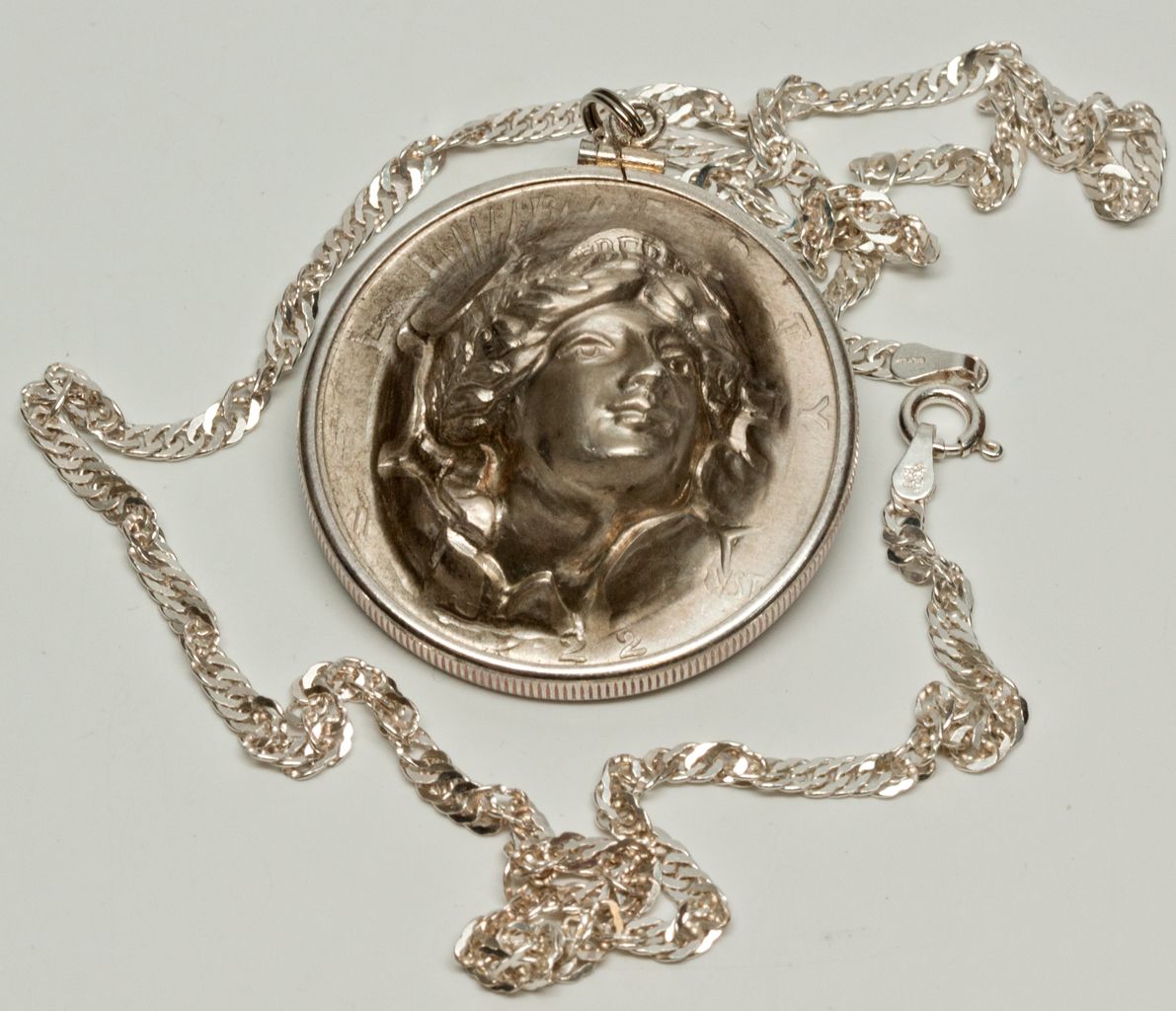 1922 silver Peace dollar with punched out liberty face with 20 inch silver chain and bezel. In a Michael and Sons fine jewelry box. -59379