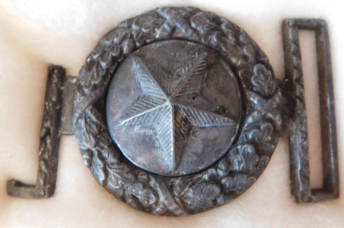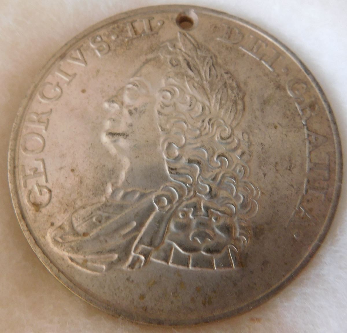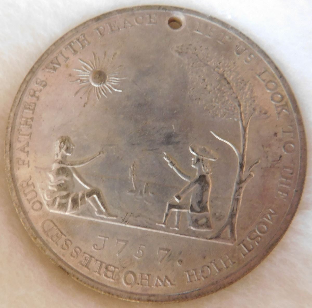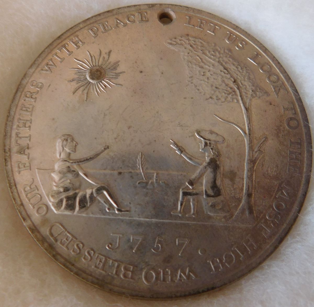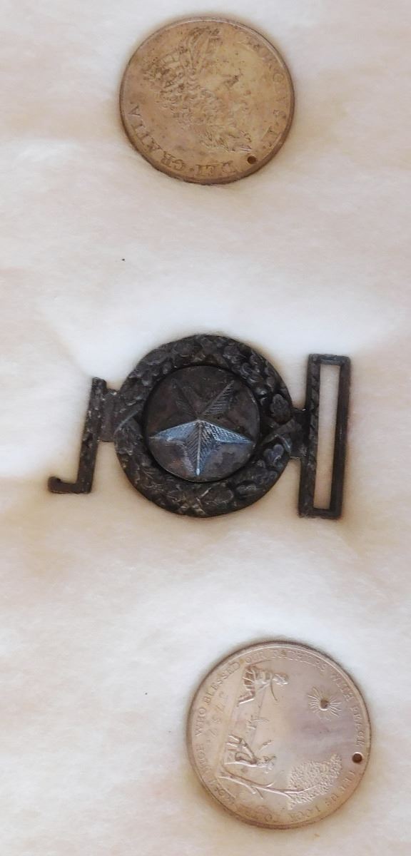 Peace Medals & Civil War Buckle, medals from 1757, made of nickel silver. Buckle measures 3.5". Eastcoast USA. Frame not included. Condition: Buckle is misssing a part, see images. Shipping: $18.50.