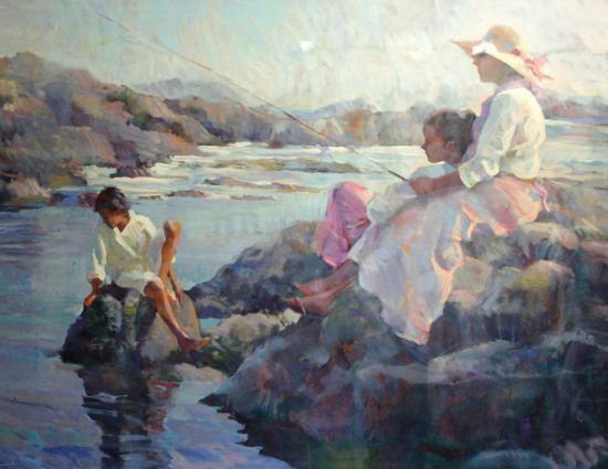 Peaceful Cove by Don Hatfield is a limited edition serigraph on foam core 1/26. It shows a mother fishing with her daughter and son. Size 34" x 42".