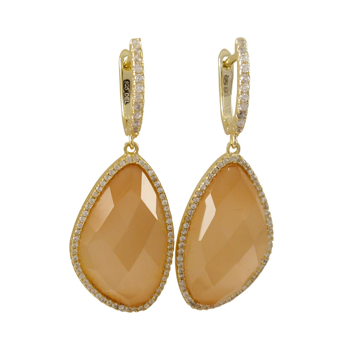Peach Cat's Eye Semi Precious Faceted Stone, With CZ Border, On Gold Plated Sterling Silver Lever Back Earrings