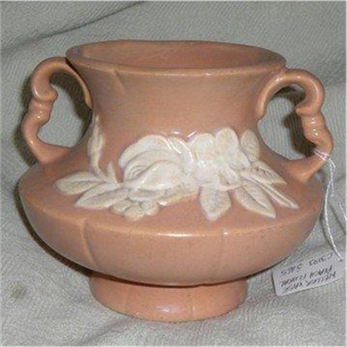 <tr><td>Title:Peach Colored Floral Weller Vase</td></tr>