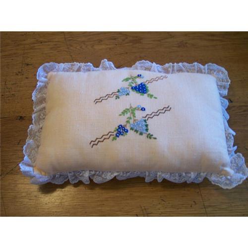There are a pair of these.This one is peach in color(linen material?)Very pretty floral needlework with French knots.Measures 13 1/2x8 1/2 not including lace trim.