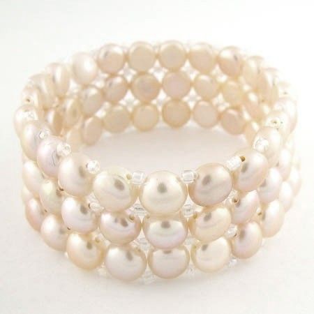3 Row Peach Pink Pearl Bracelet - Genuine 7mm Fresh Water Pearls - 7" Strech Bracelet - Sterling Silver Accent Beads