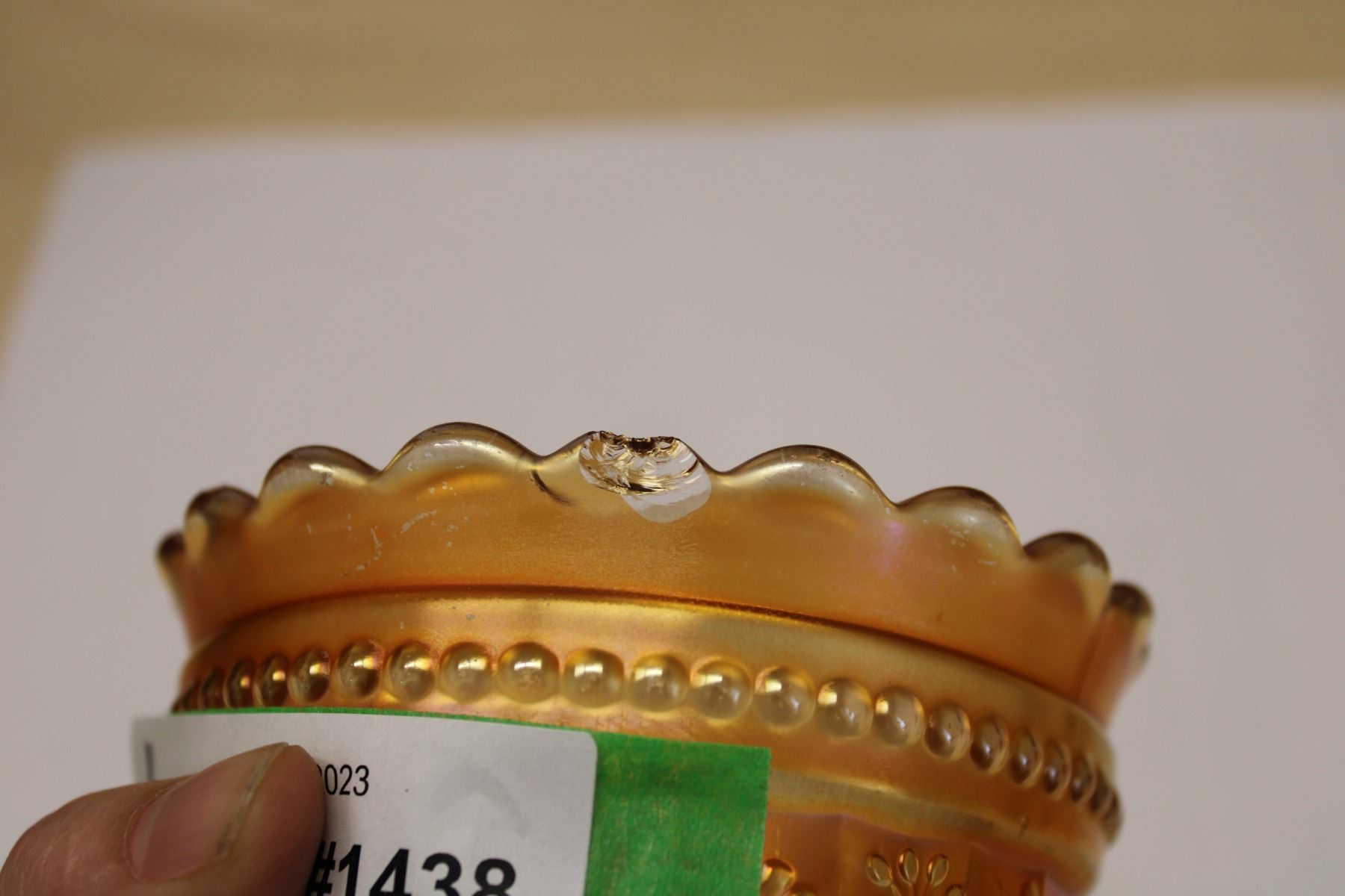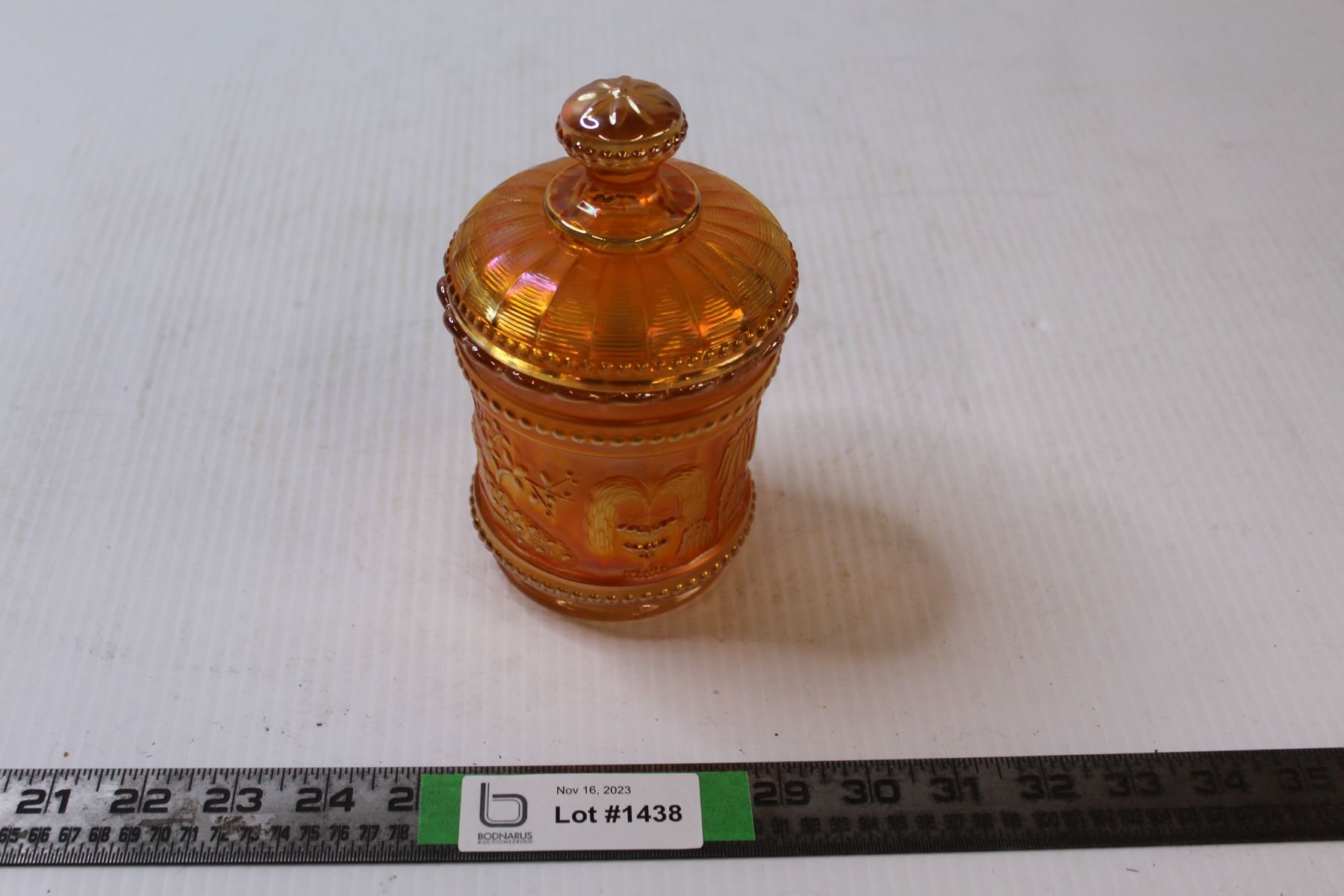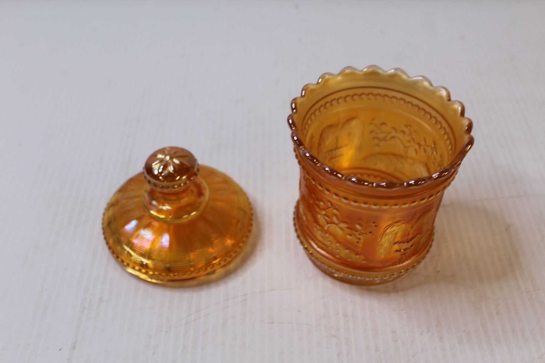 Peacock At The Fountain Carnival Glass Spooner w/ Lid - Has Chip